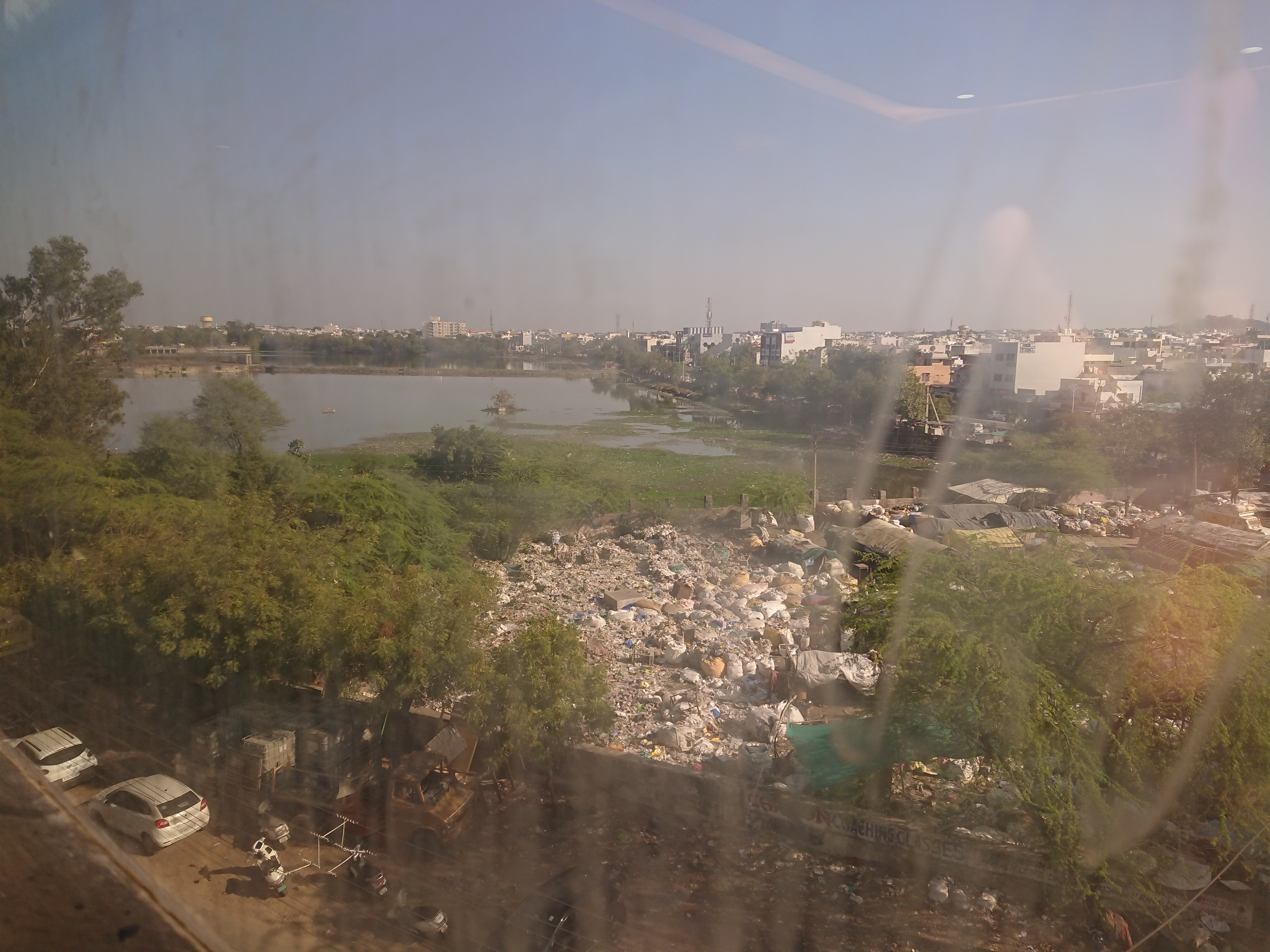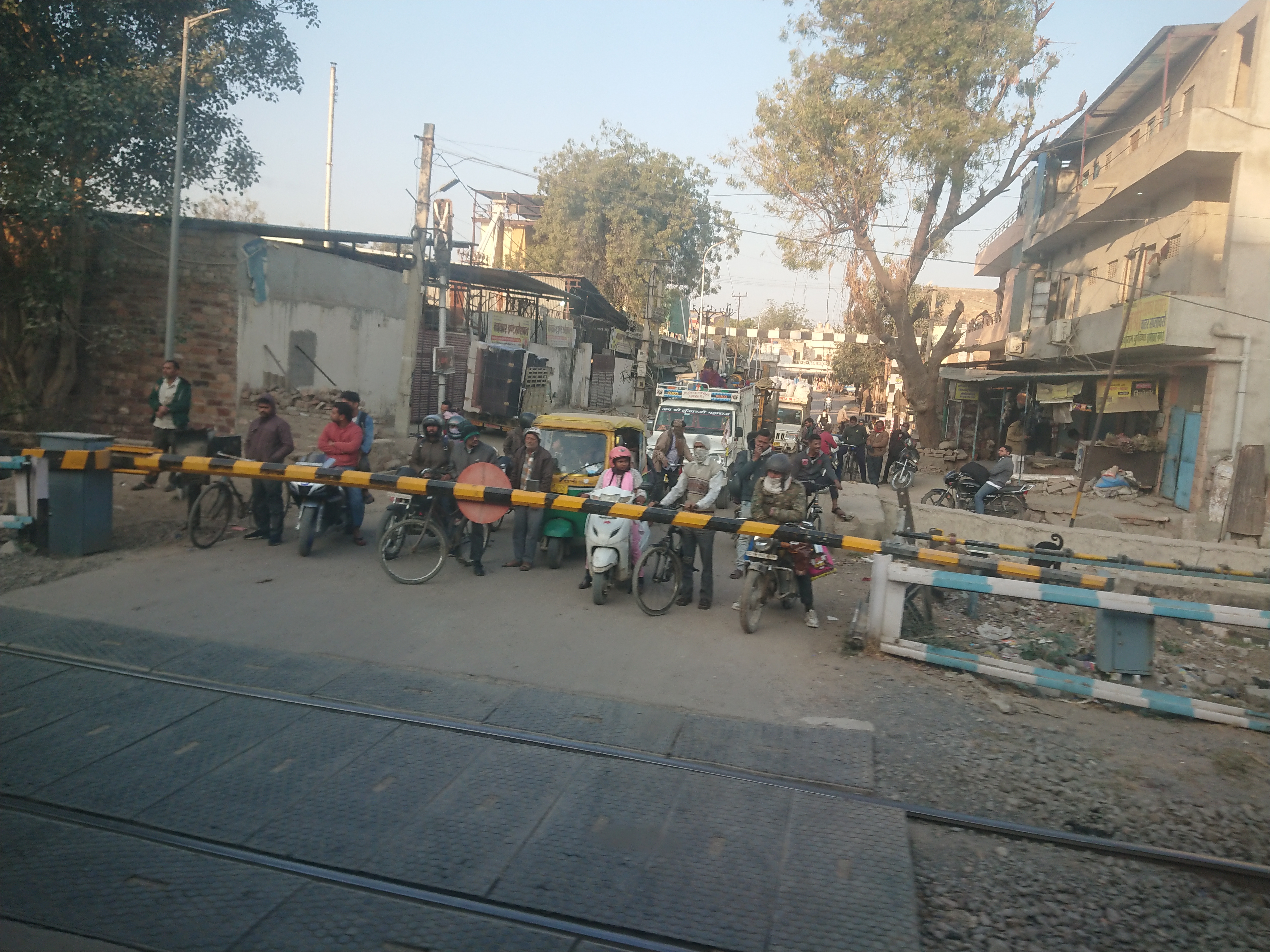 J’aime les voyages en train. Vous avez l’impression de passer incognito par le fond des jardins et des cours, contrairement à la route où vous êtes au cœur de l’action. Parti au petit matin, je n’ai pas retrouvé les gens des bidonvilles se promenant sur les voies à la recherche d’un endroit où faire leurs besoins avec, à la main, un petit pot en fer contenant l’eau faisant office de papier toilette. La position la plus prisée était de s’accroupir, les pieds sur les rails, pour déféquer tranquillement sur la voie. L'avantage de la kurta, c'est que les longs pans avant et surtout arrière servent de paravents. Pour éviter la vie sous toutes ses formes sur les voies, il y a un gros effort pour isoler les voies ferrées de la ville en construisant des murs et en posant des grillages.. un peu de répression aussi je suppose.
