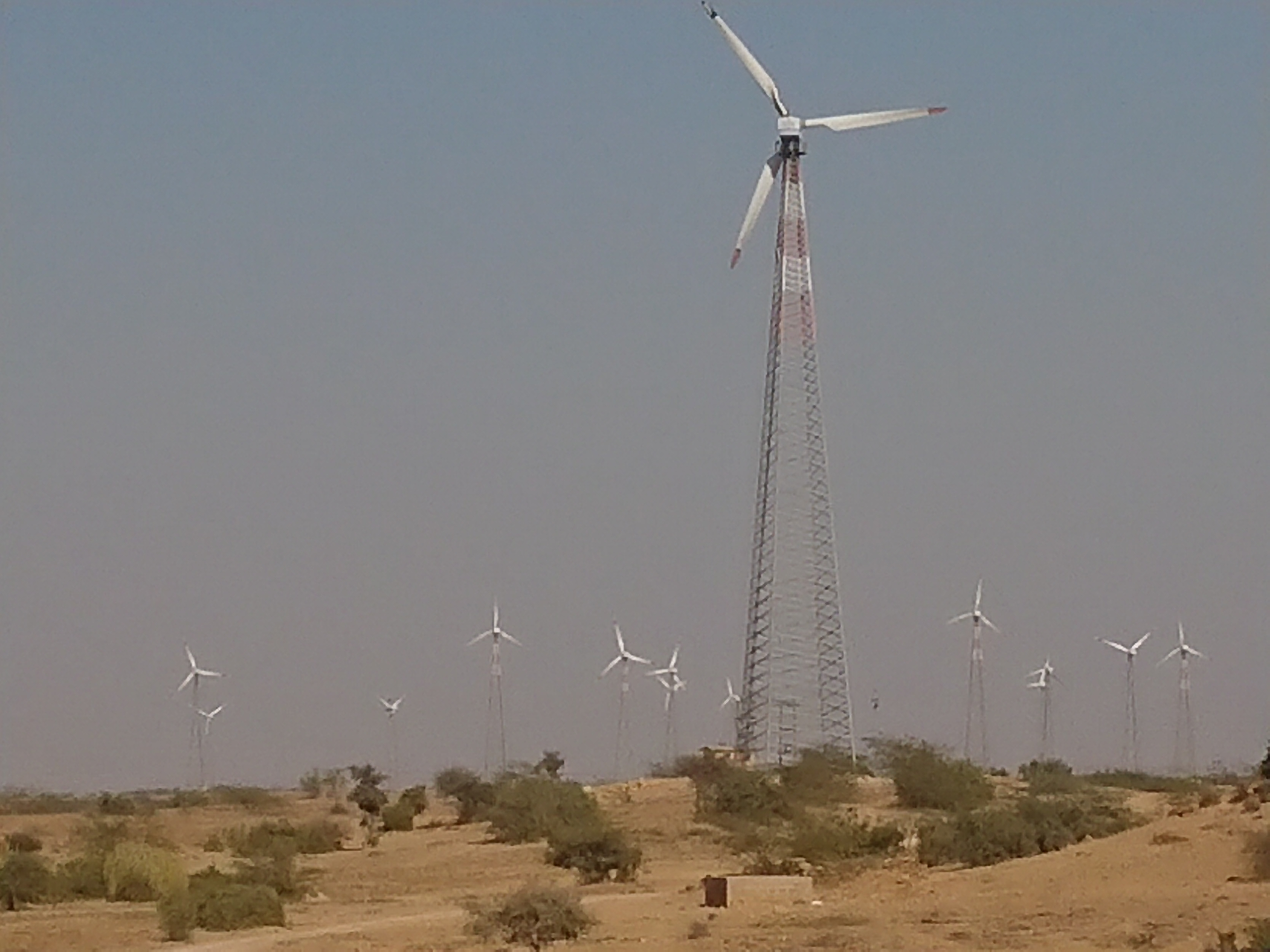 Aujourd’hui, j'ai vu mes premières éoliennes. Il faut dire que je suis au milieu du Jaisalmer Wind Park [1], un des plus grands parcs éoliens du pays. Développé par la société indienne Suzlon Energy, ce parc a atteint une capacité installée de 1 064 MW en 2012, en regroupant diverses éoliennes de puissances variées, allant de 350 kW à 2,1 MW. Pour comparer avec la France, cette production est 12 % moindre que celle de la Normandie, pourtant bien plus petite en surface. Autre comparaison, le Rajasthan produit 6,8 MWh par km², près de 15 fois moins que la France (91,7 MWh par km²).