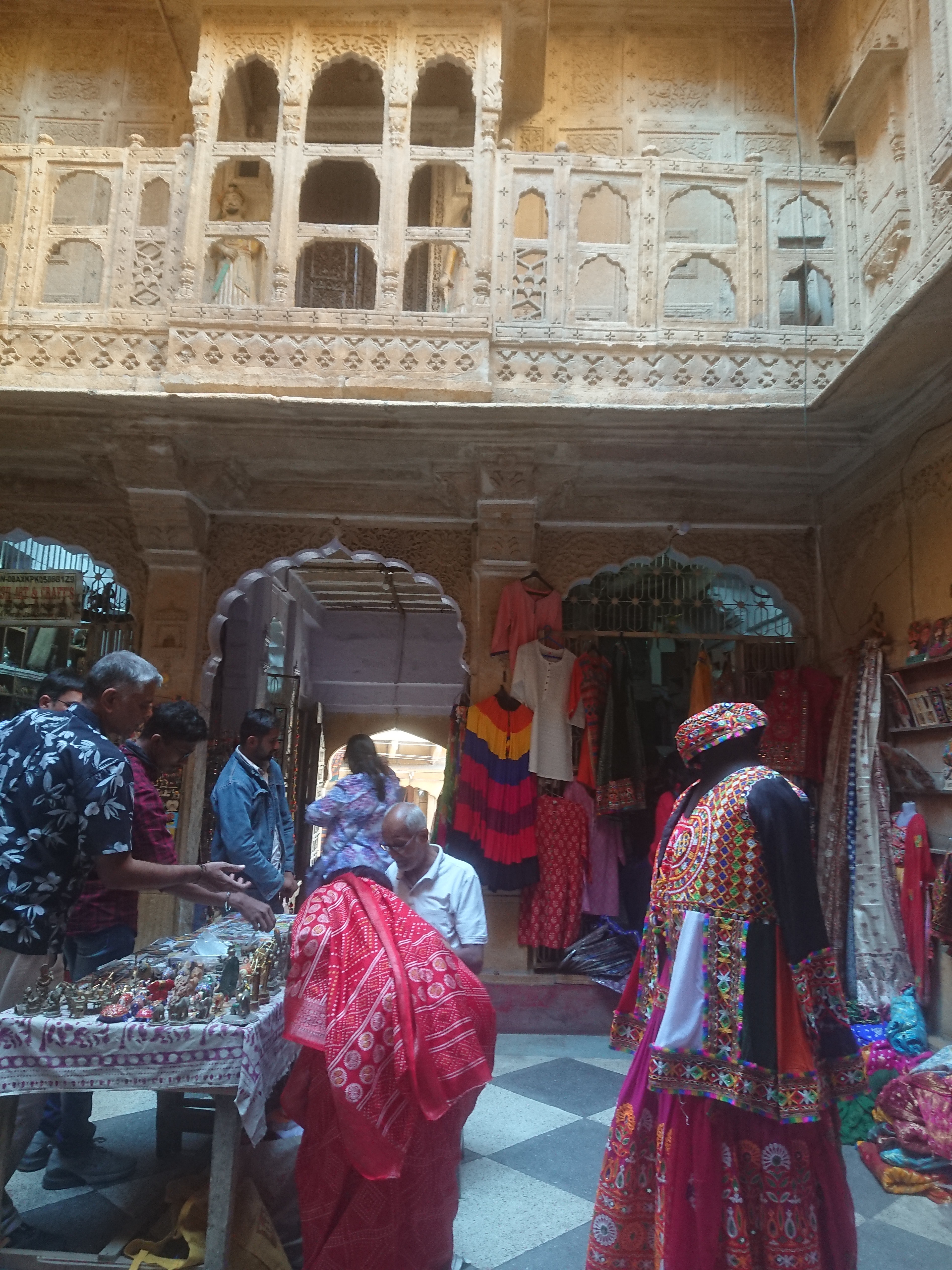 Alors qu'à l'aller, assis à l'arrière de la jeep, je n'avais rien vu, j'étais à l'avant au retour et j'ai pu profiter du paysage. On voit beaucoup de bétail – vaches, chèvres et moutons – au bord des routes, mais aussi au milieu des arbres et des arbustes. J'ai vu mes premières éoliennes, mais étonnamment, pas de panneaux photovoltaïques. De temps à autre, des châteaux d'eau permettent d'irriguer quelques champs, tâches vertes inattendues au milieu de ce paysage désertique. Régulièrement, on aperçoit des espaces parsemés de tas de la fameuse pierre de Jaisalmer. Elles doivent être ramassées dans la campagne avant d'être amenées en ville pour être taillées par des ouvriers travaillant à même le sol, sur les trottoirs.