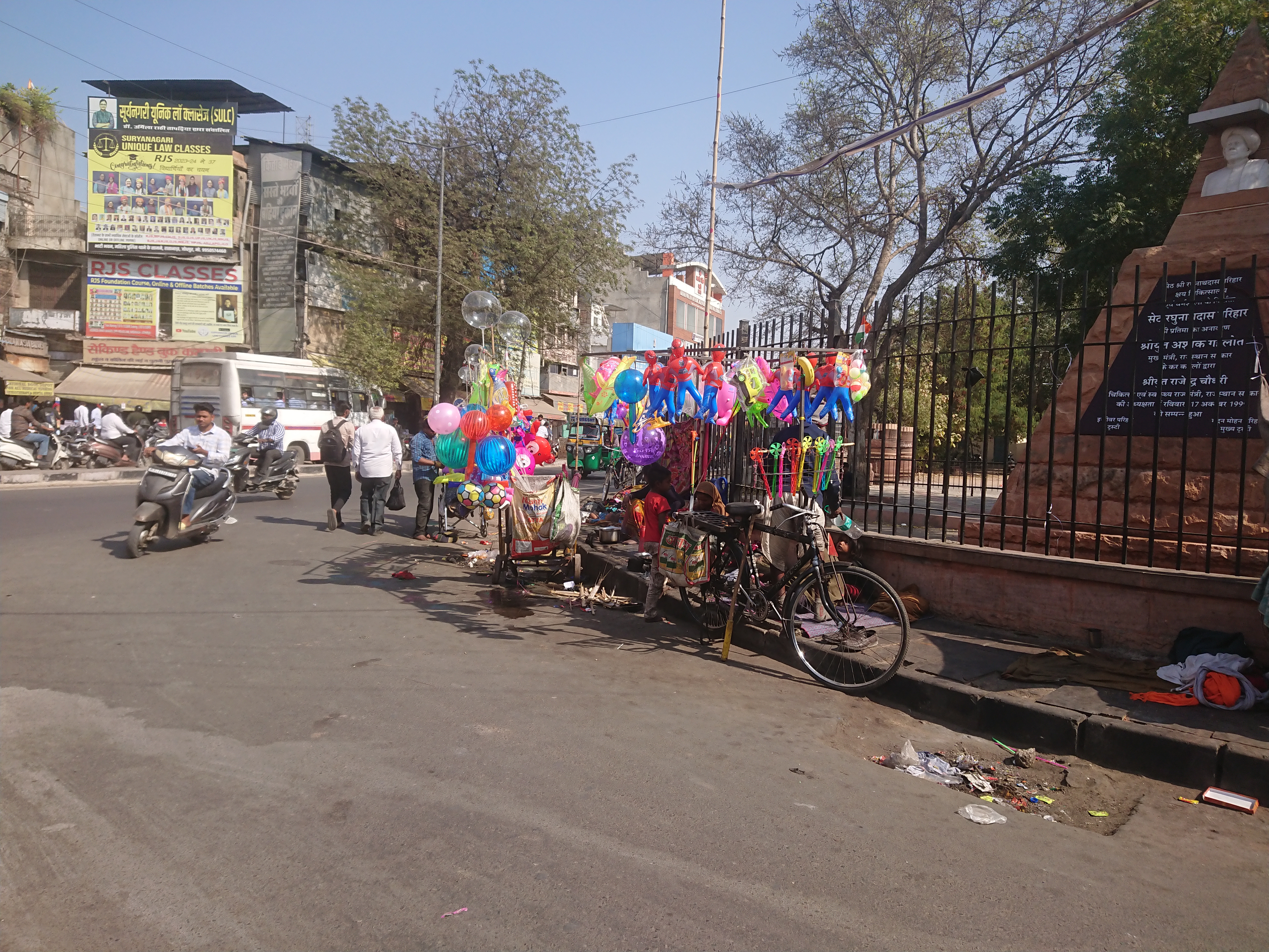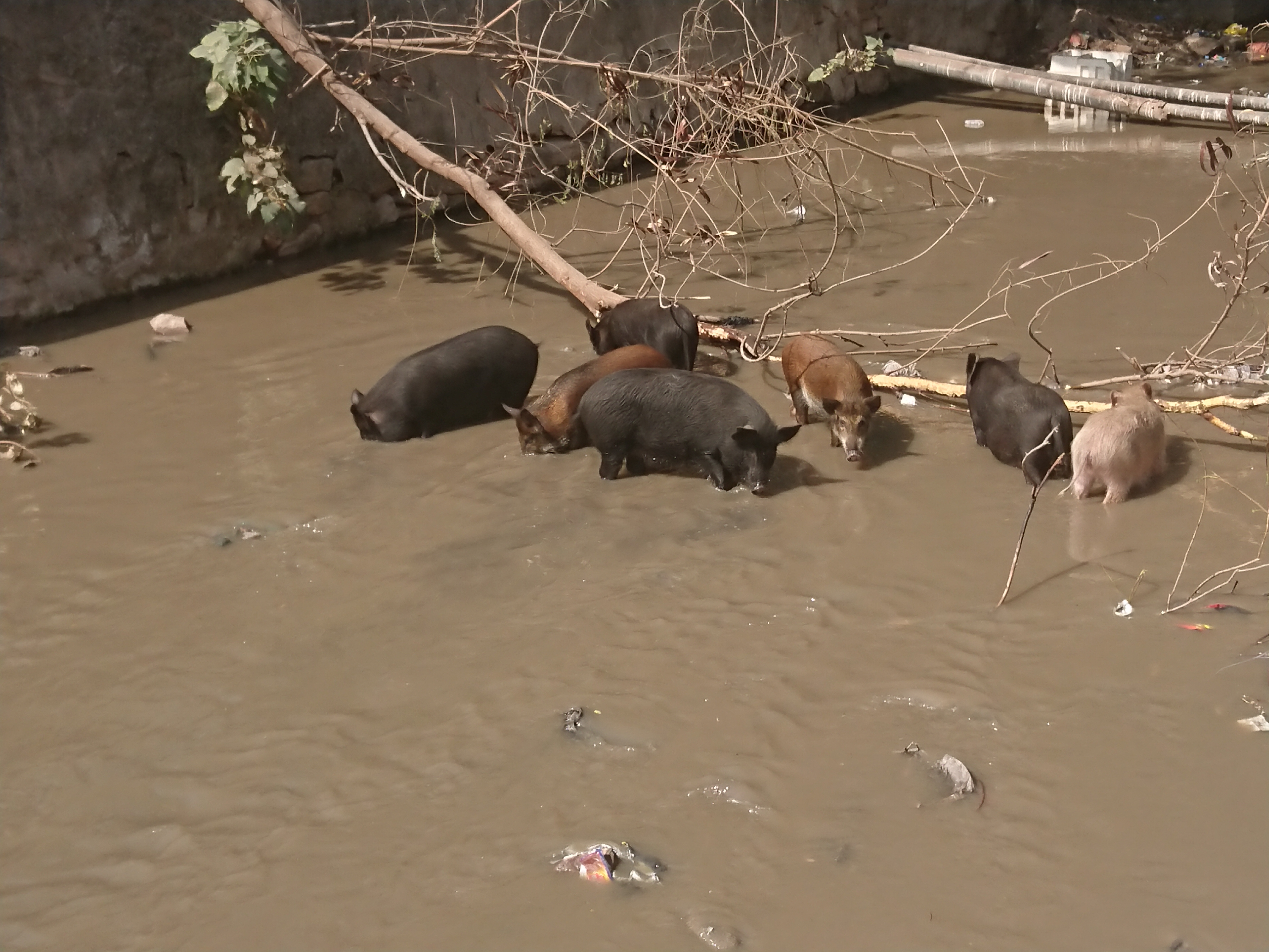 Je suis ensuite allé visiter le quartier derrière mon hôtel. Nous sommes à un peu moins d’un kilomètre du centre-ville, dans un quartier résidentiel avec de grandes avenues arborées qui délimitent des sortes de lotissements : petites villas avec une cour devant, un peu de végétation et surtout du calme. Et au milieu coule une rivière... ou plutôt soyons honnêtes, un égout, où j’ai vu pour la première fois des cochons. Étonnant, alors que seuls les chrétiens, les Adivasis et les athées (si, si, il y en a) consomment du porc. On voit aux boutiques qu'on est dans une zone "middle class" de l'électroménager, du téléphone et même un bar avec alcool où je suis ce soir.
