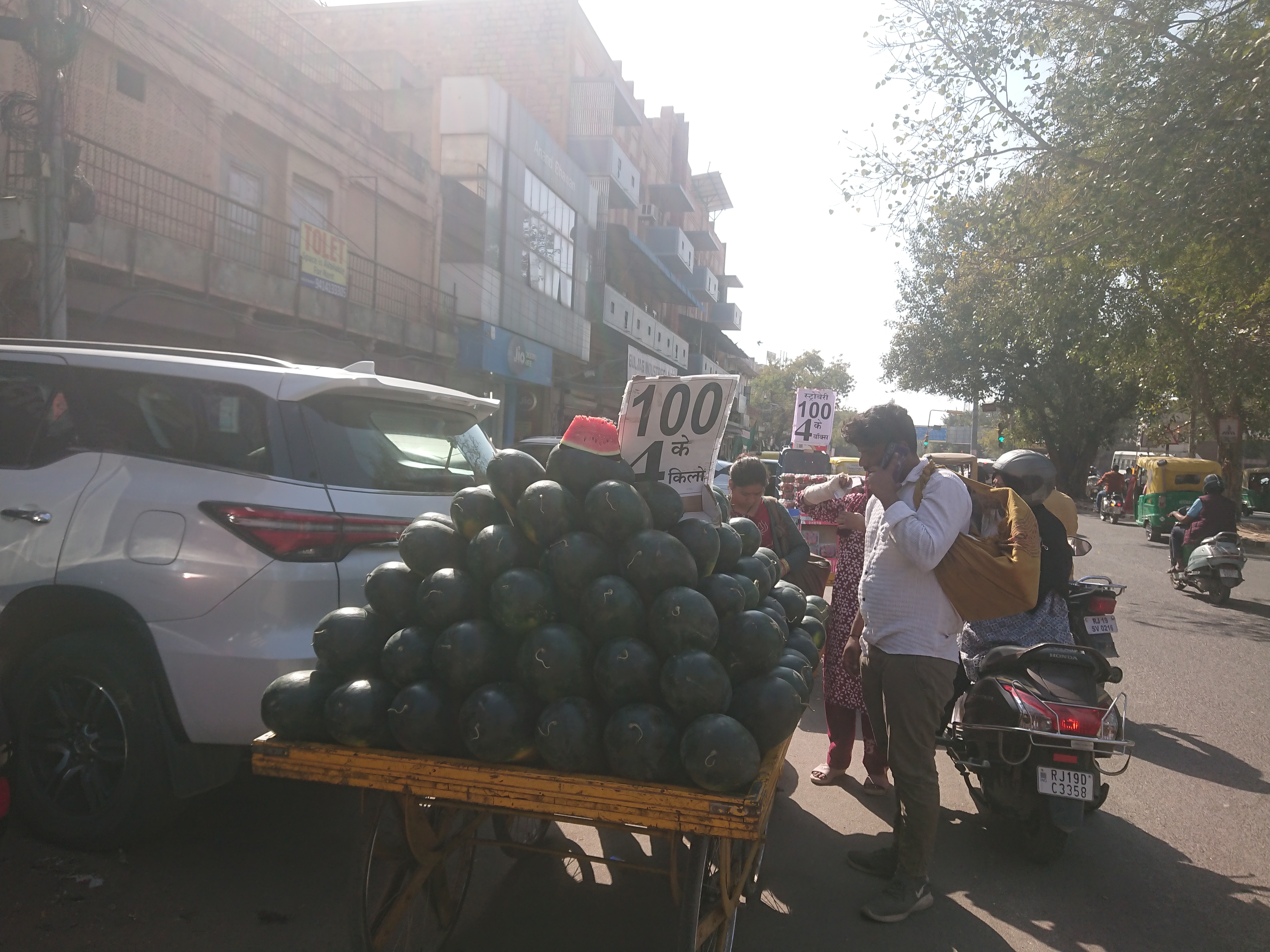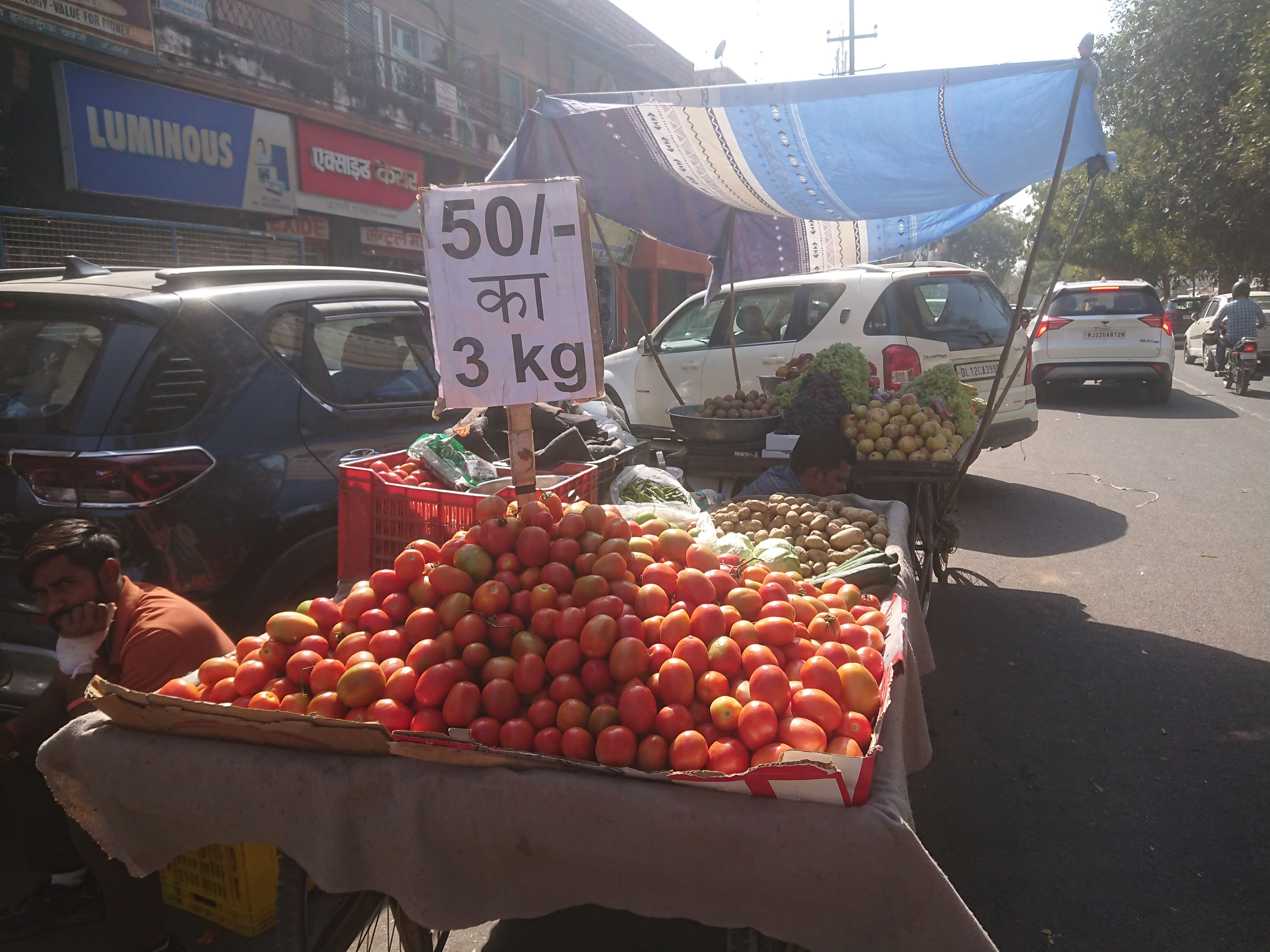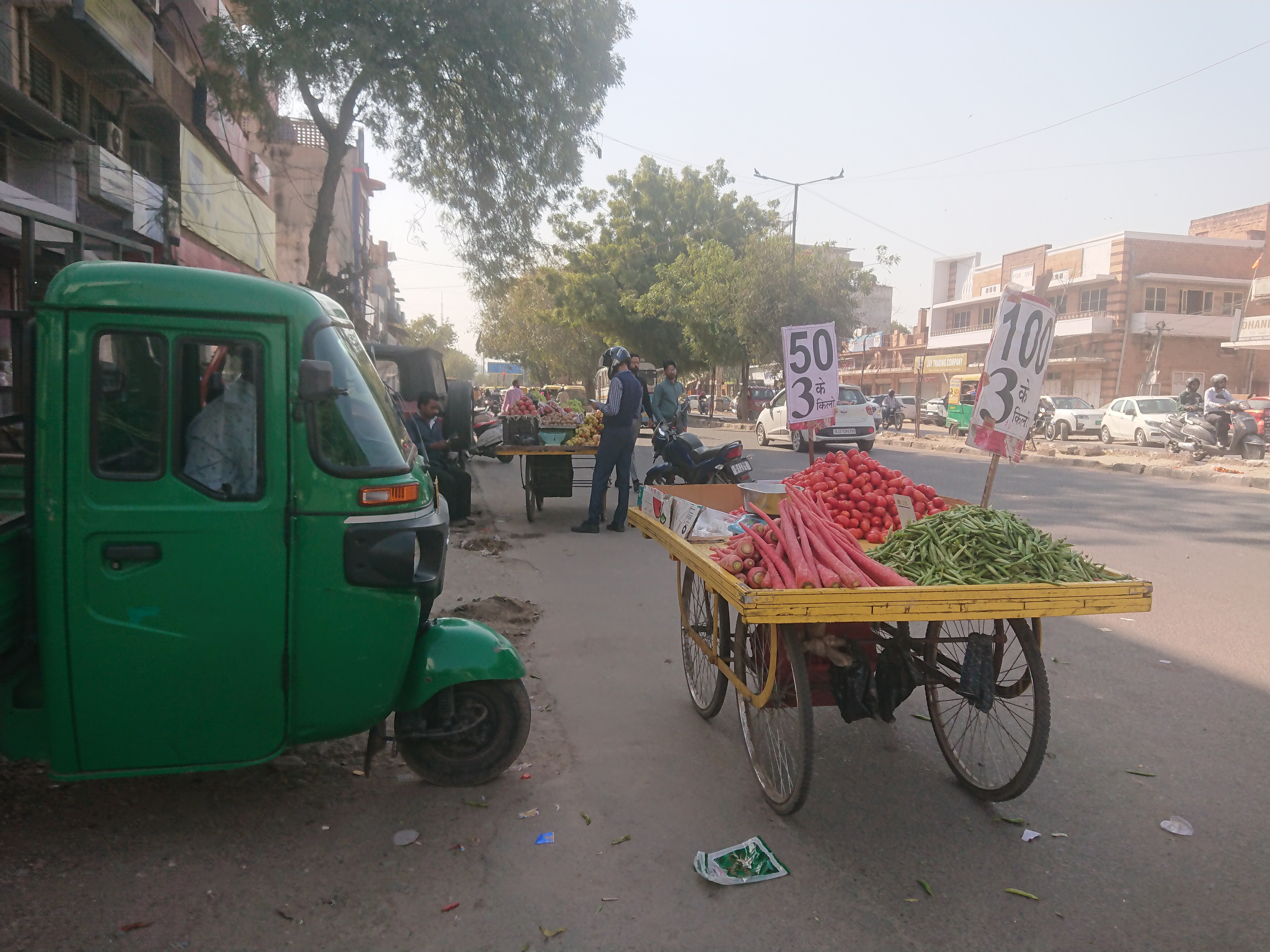J’ai aussi découvert un marché de légumes avec des prix affichés. J’en connais au moins un qui va désespérer : 50 roupies (65 centimes) pour 3 kilos de tomates ou 100 (1,3 €) pour 4 kilos de pastèques. Au marché de Béziers, on est à 2,5 € le kilo pour les cucurbitacées et 5 € pour les tomates. Oui, mais c’est du bio et des variétés anciennes ! Cela dit, cela me semble un peu tôt dans la saison. À en juger par les étals, ces produits sont probablement locaux, mais cela m’étonne : il y avait bien des tomates dans la ferme de Radhakrishnan, mais il ne plantera ses pastèques que la semaine prochaine.