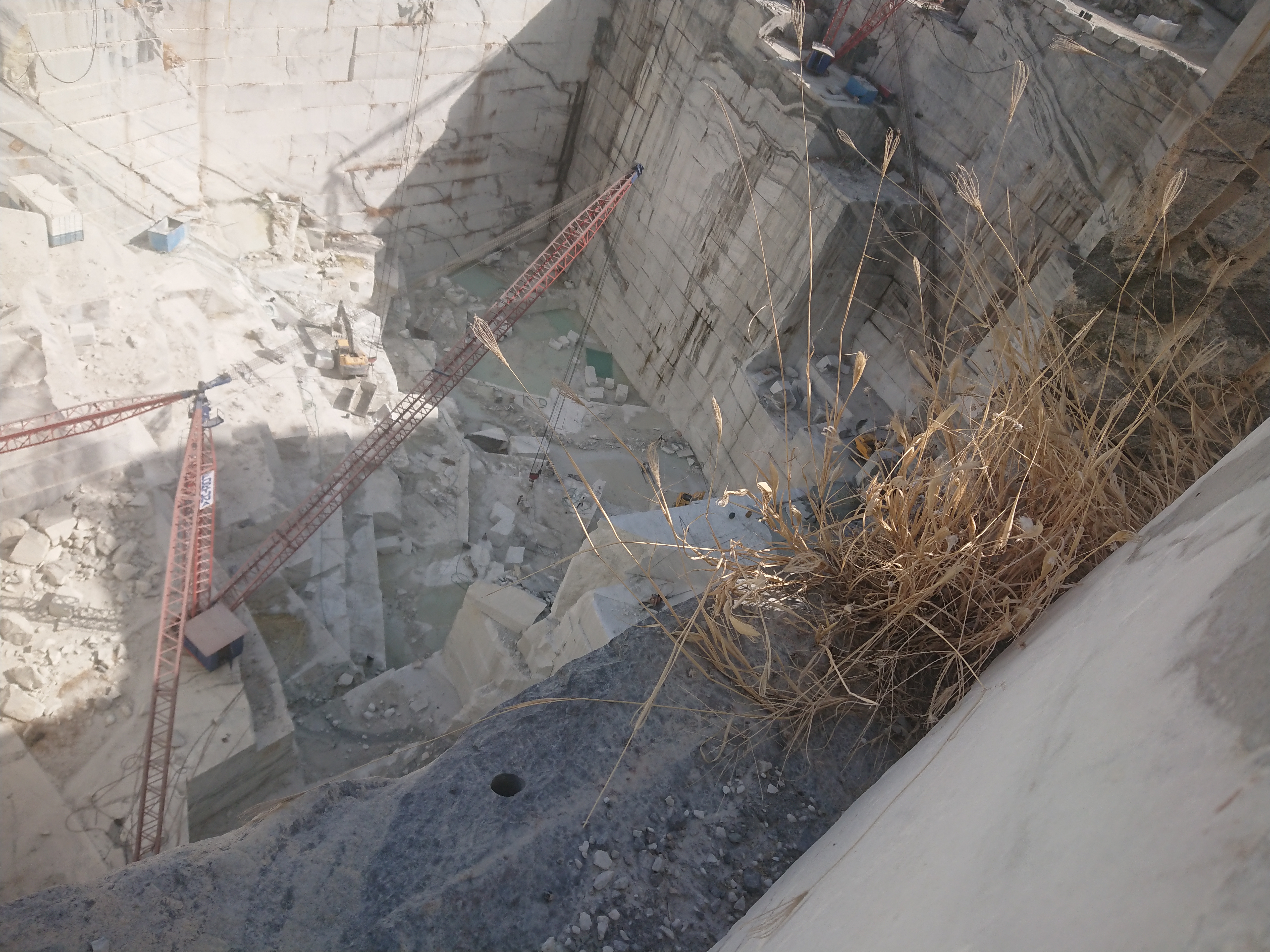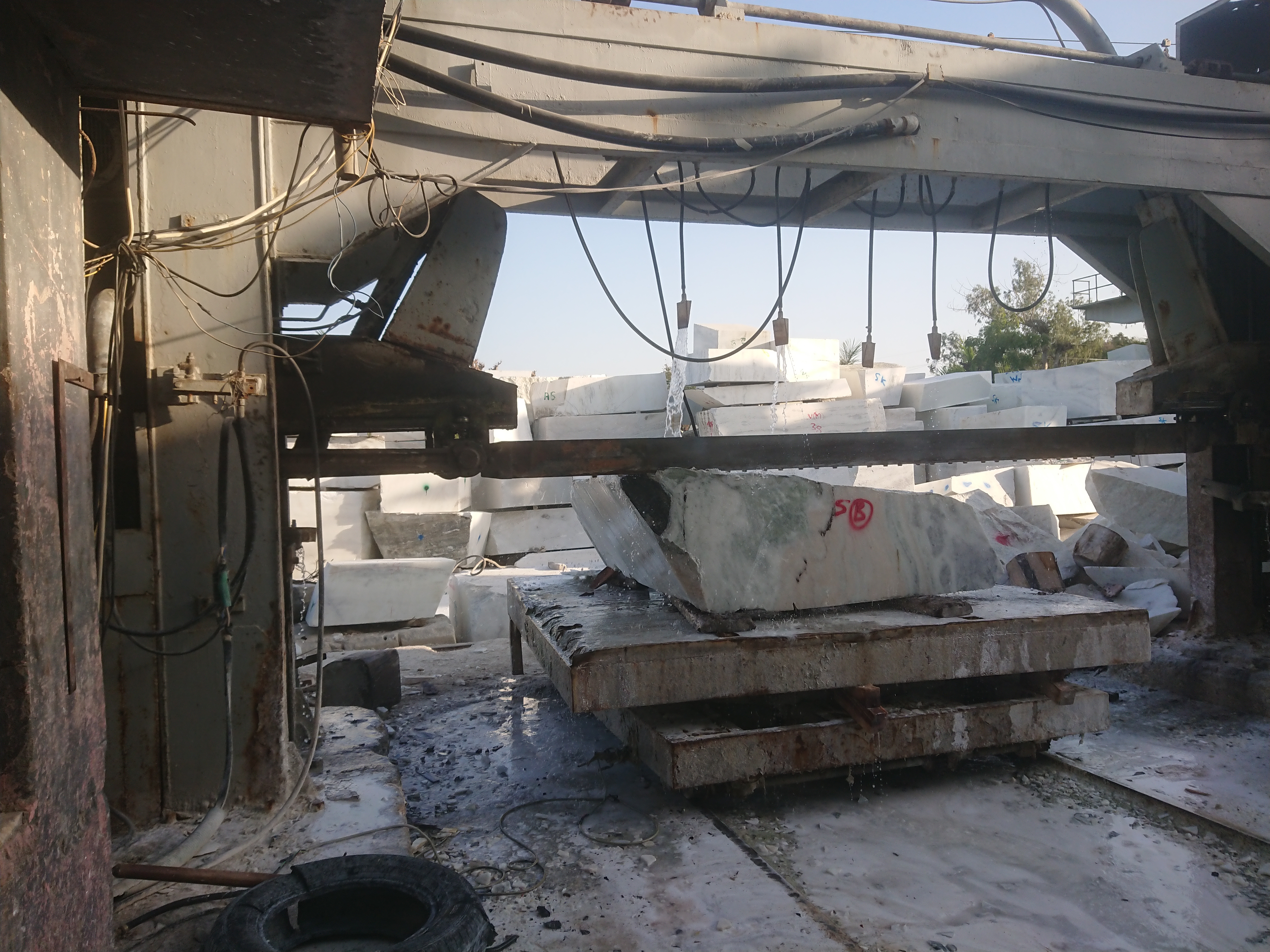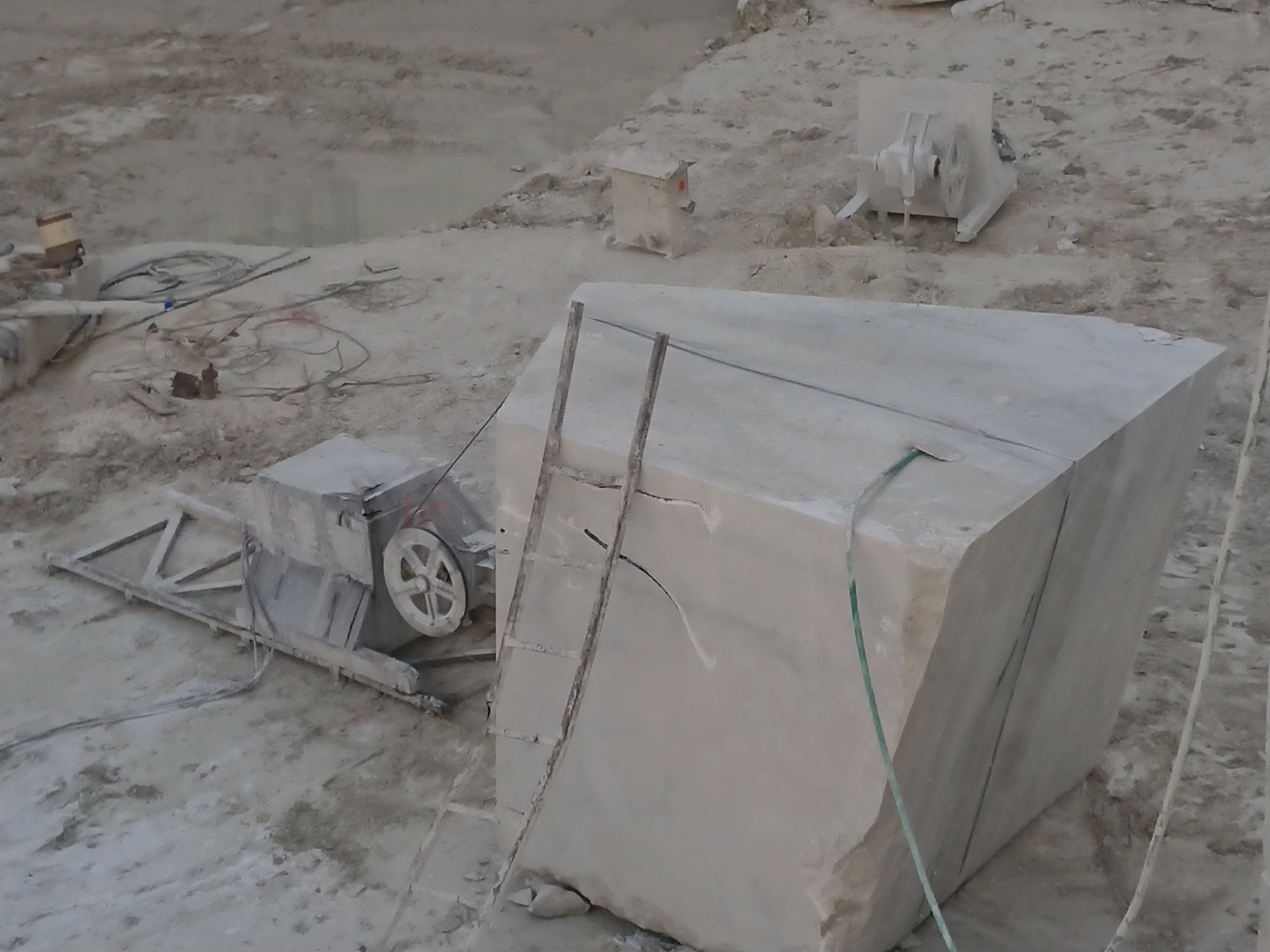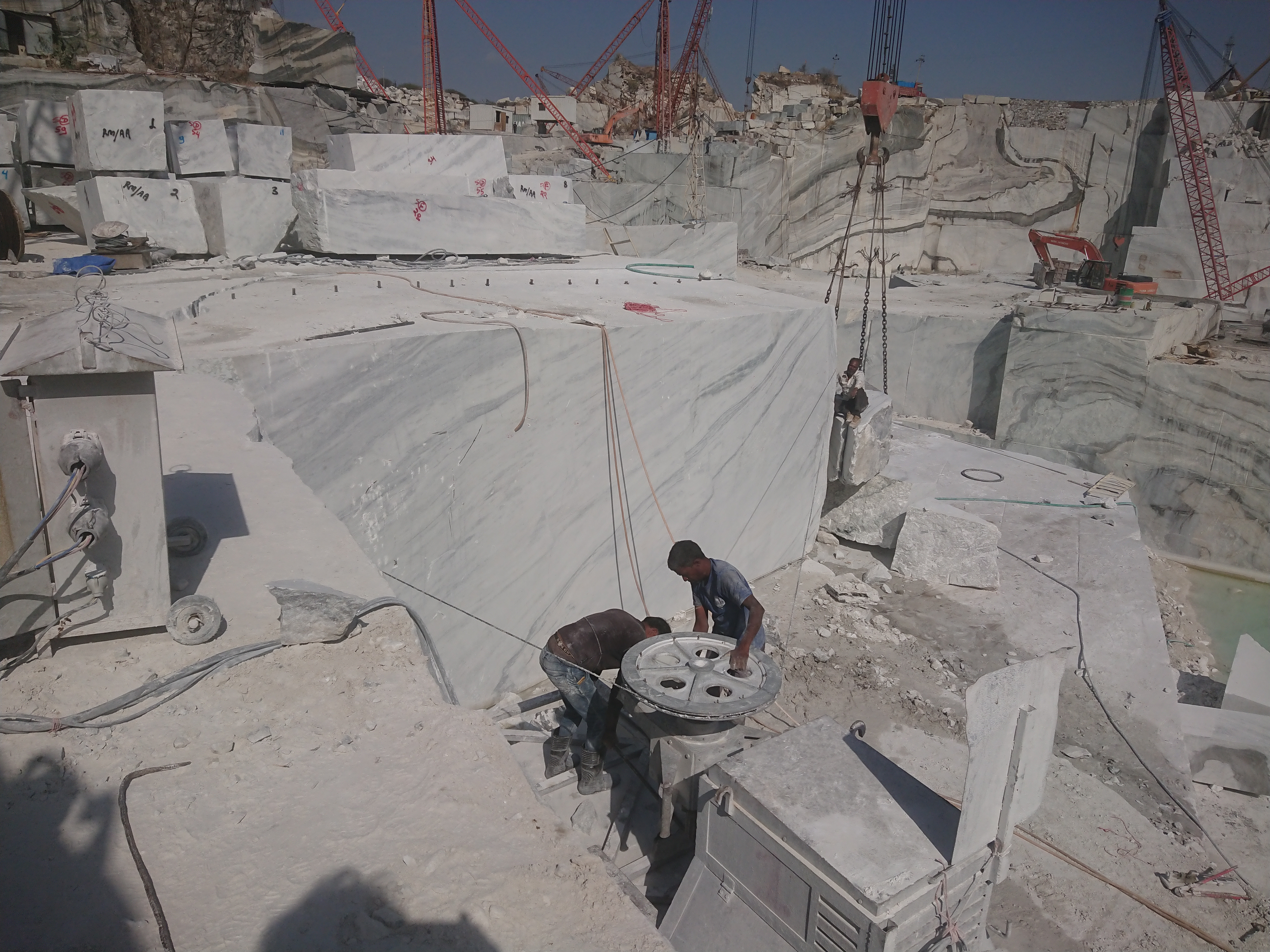 Pour extraire le marbre, on fait un L en perçant deux trous un vertical et un horizontal permettant de passer un câble avec des anneaux en diamant qui fait office de scie. Pour découper les plus gros blocs, il faut parfois quatre heures et beaucoup d’eau pour refroidir le câble.