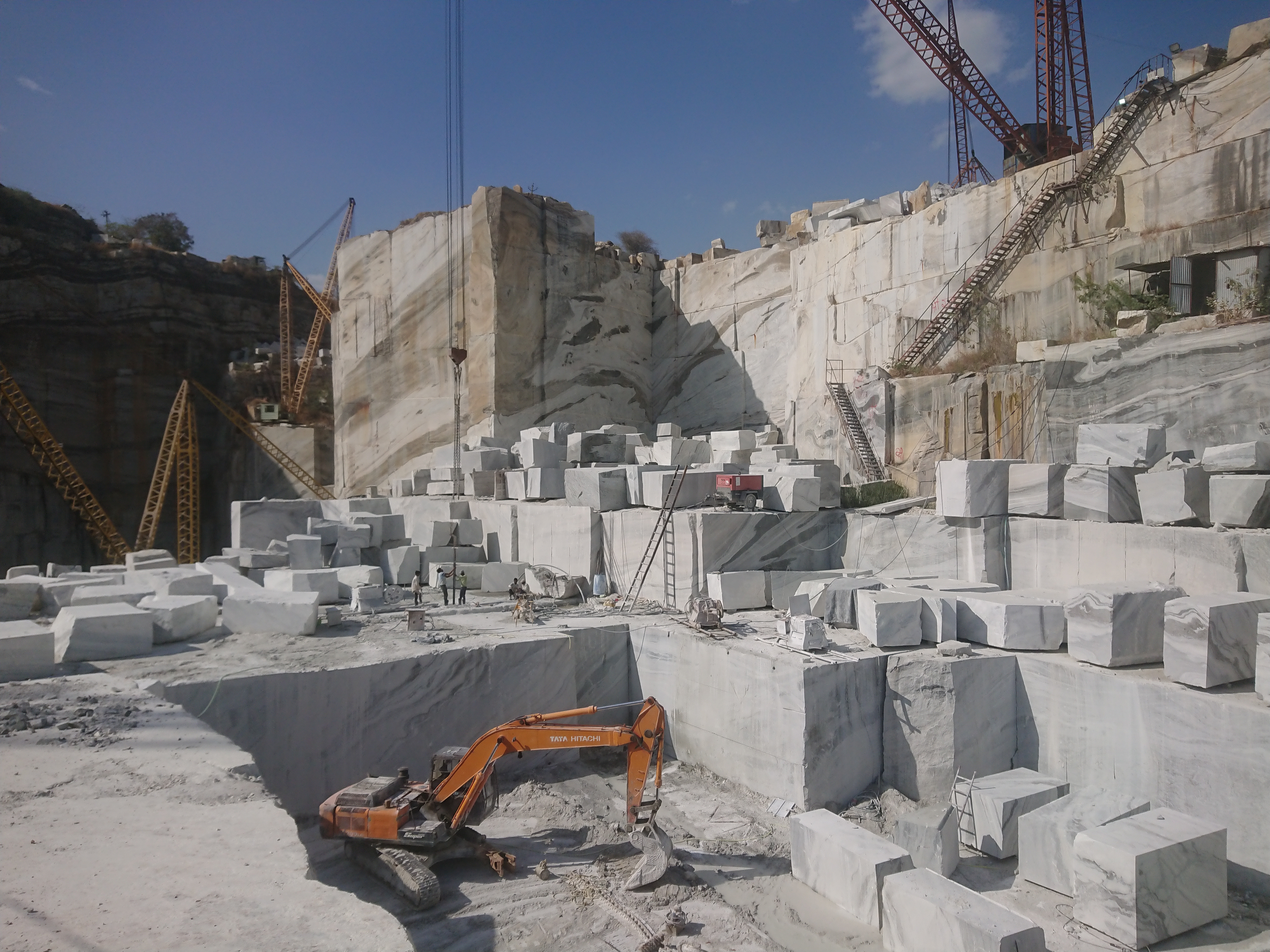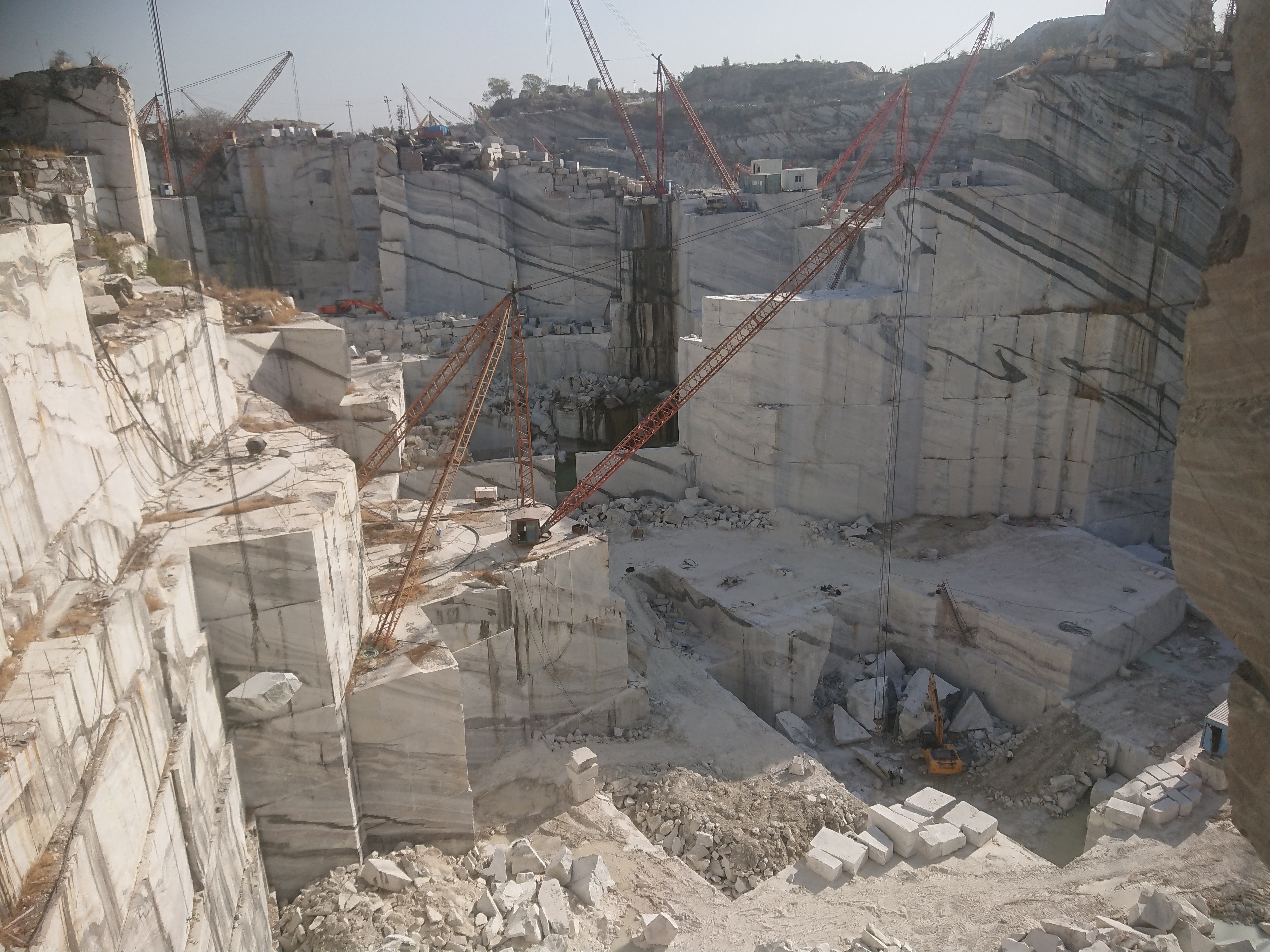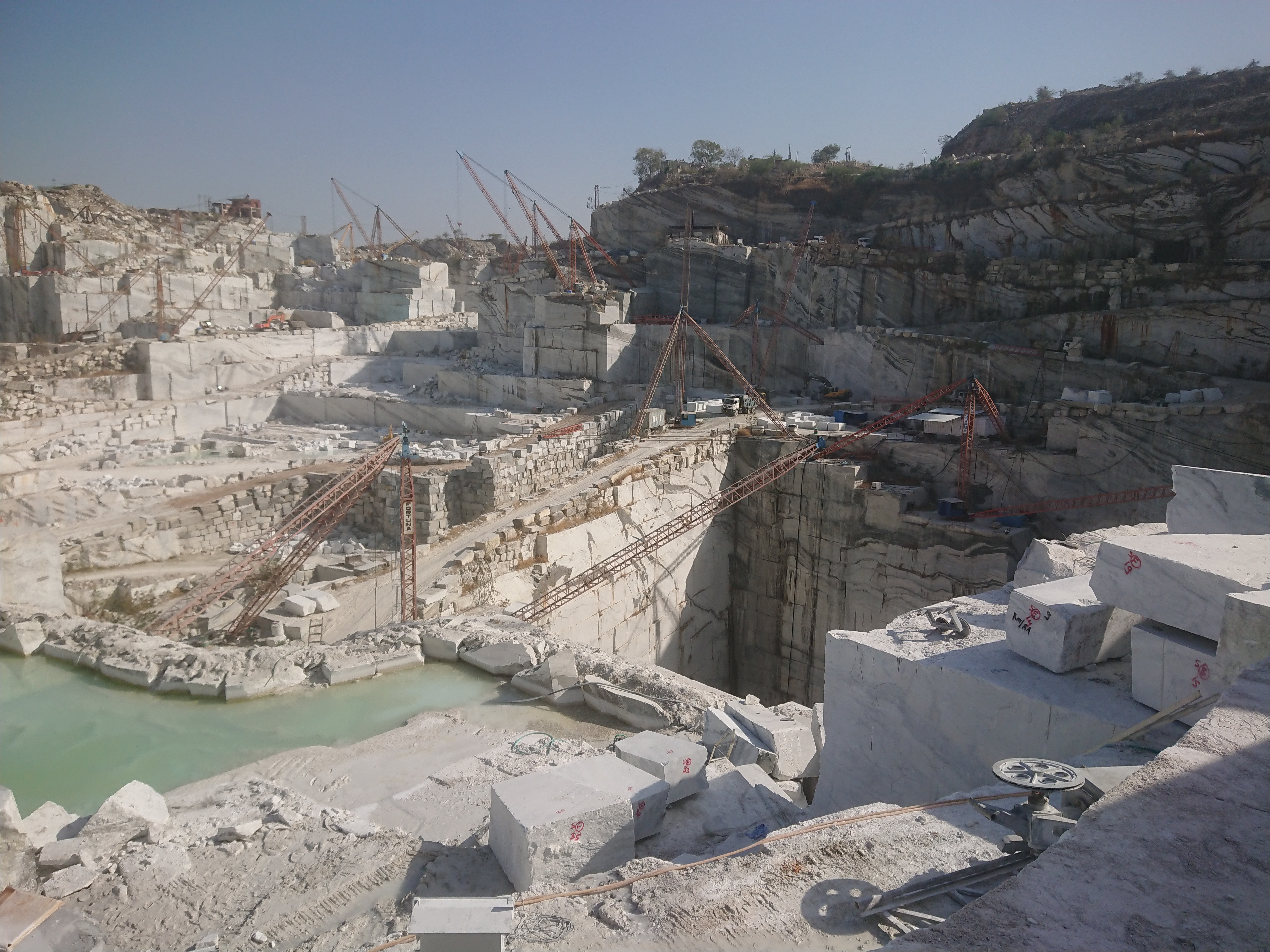 L'après-midi, Naveen m’a emmené visiter la carrière de marbre blanc où travaille l'oncle de Naveen, située à une dizaine de kilomètres d’Amet. Moins connu que celui de Makrana[4] qui a servi à l'édification du Taj Mahal, le marbre blanc d'Amet et du Rajsamand est de même qualité. Mes seules références en la matière étaient Naxos pour le marbre blanc, la descente sur Mali à Tinos pour le marbre vert…et Cessenon pour le marbre rouge mais on est ici dans une autre dimension. La colline a été entièrement creusée sur plus de 300 mètres de hauteur. Les parois ressemblent à un empilement de blocs rectangulaire de plusieurs mètres de haut. En bas les poclains[5] semblent des jouets, partout des grues avec des longs bras en biais capables de porter des blocs de plusieurs tonnes.