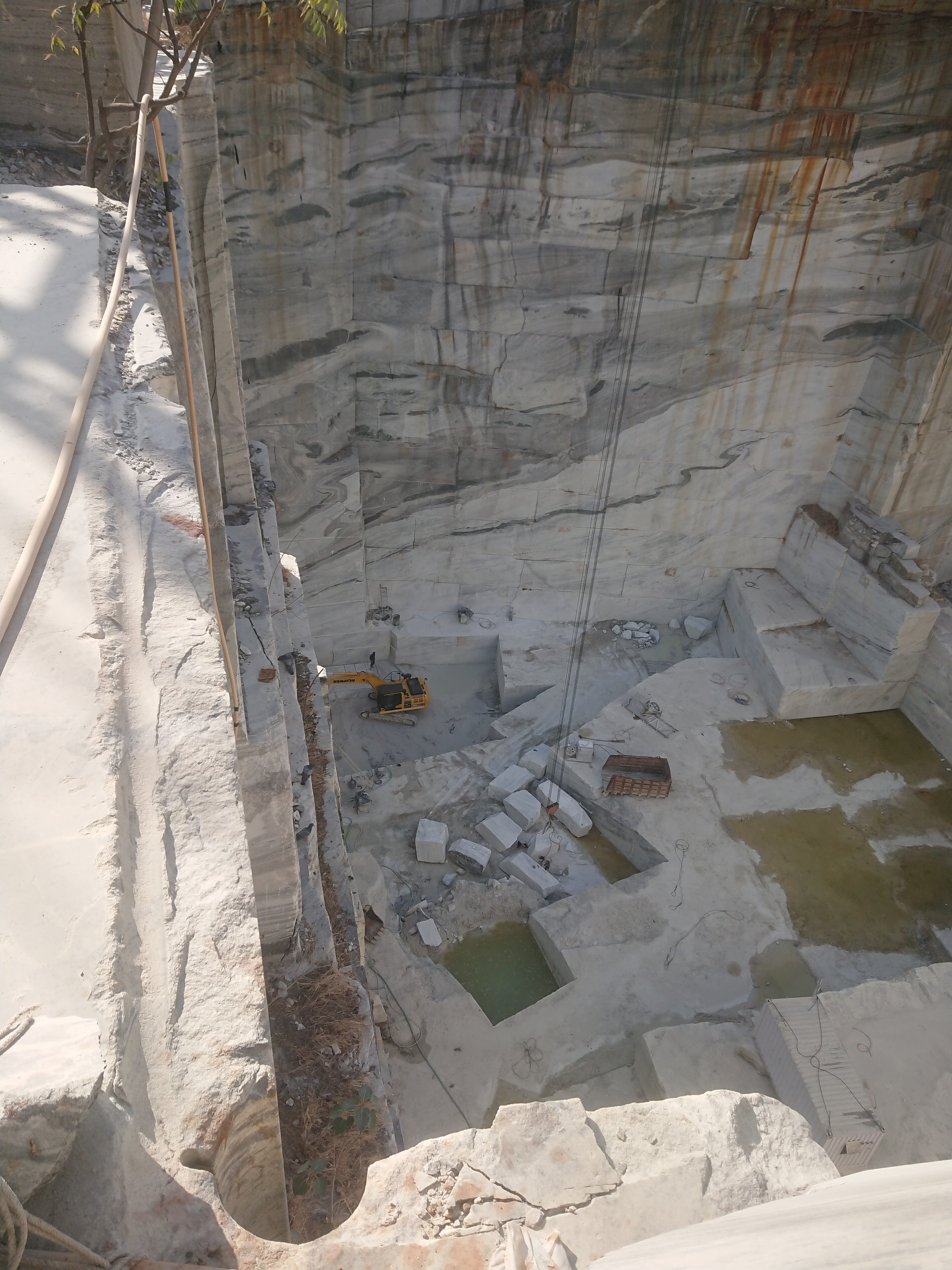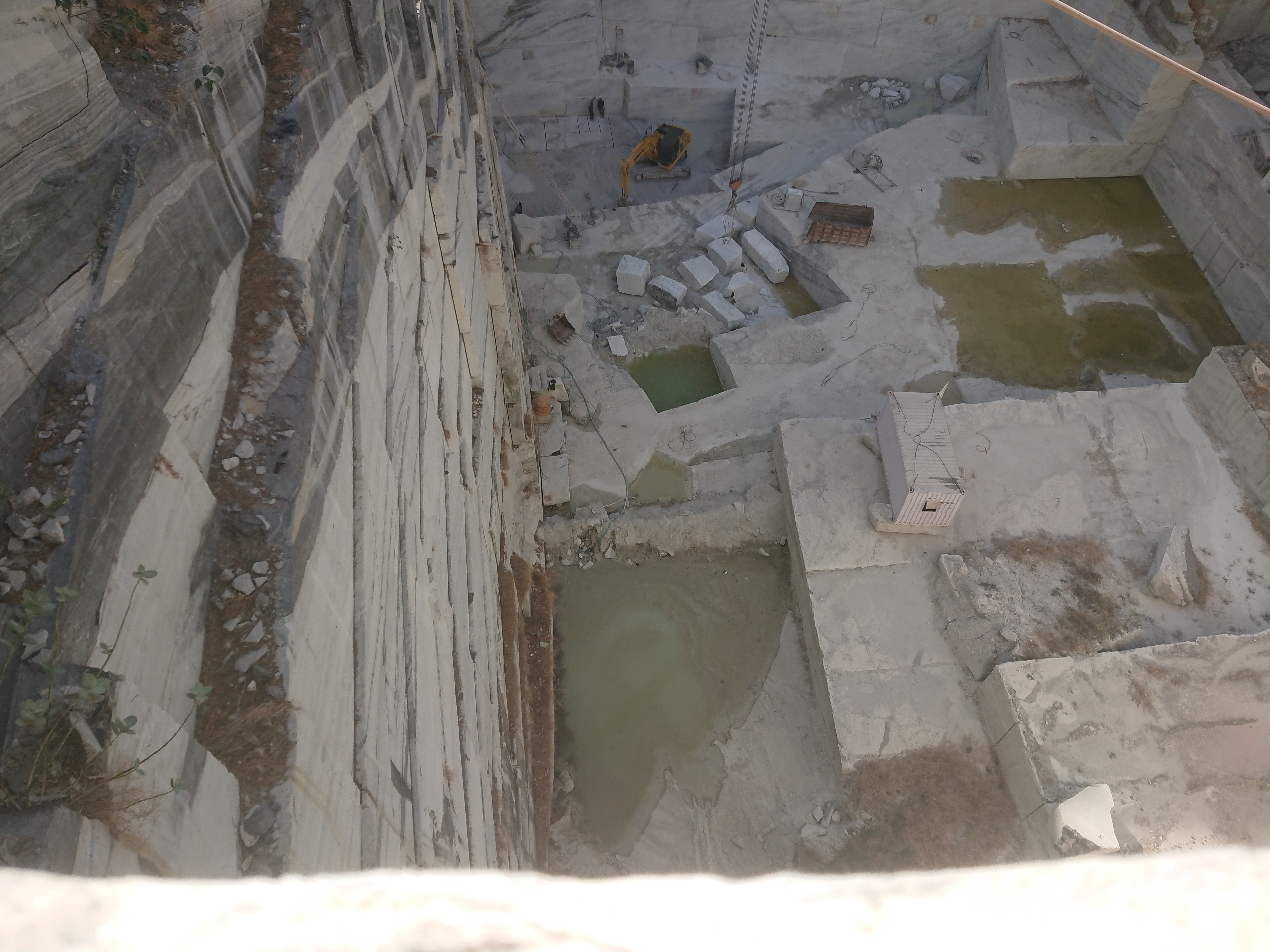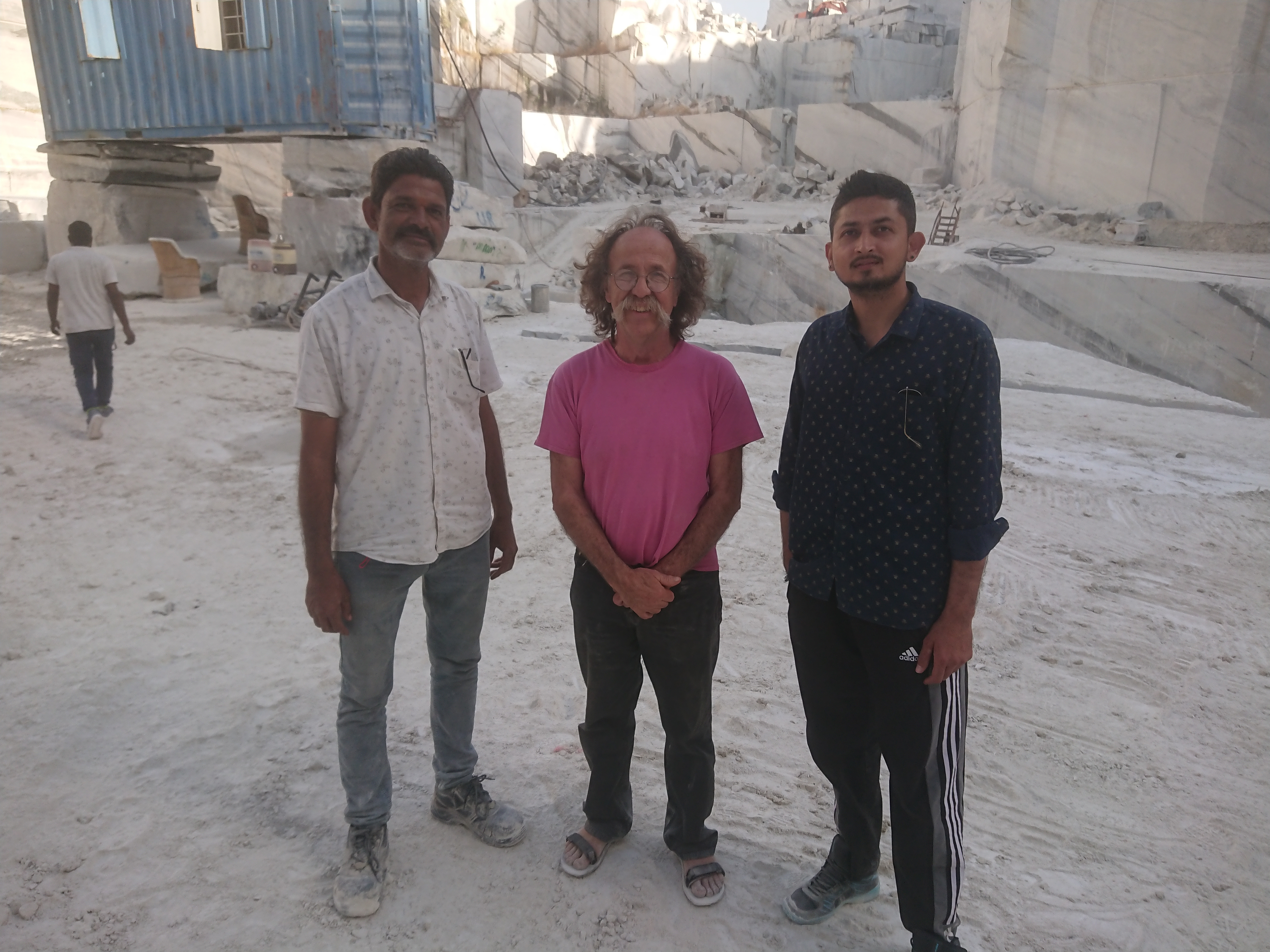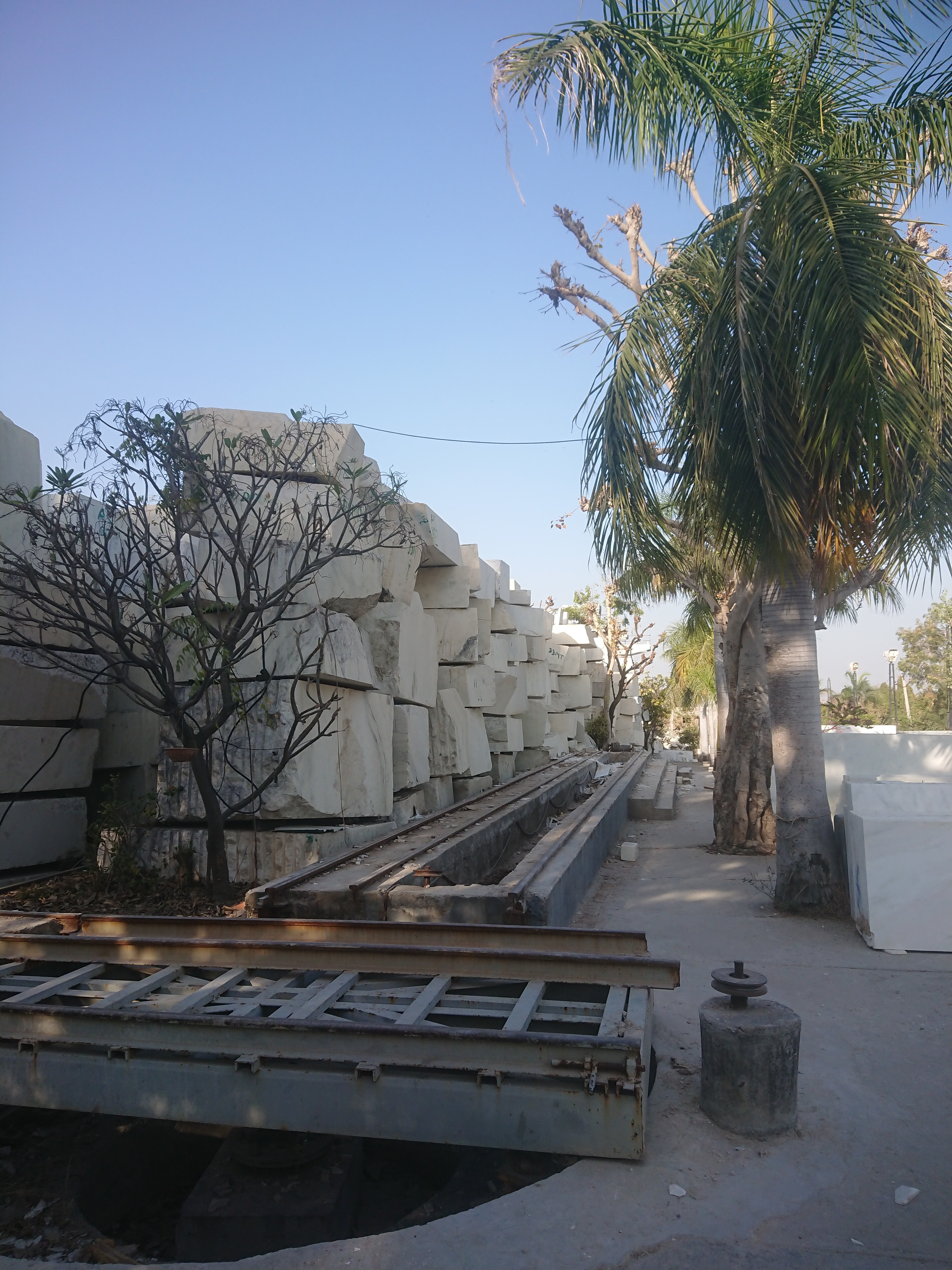 L'après-midi, Naveen m’a emmené visiter la carrière de marbre blanc où travaille l'oncle de Naveen, située à une dizaine de kilomètres d’Amet. Moins connu que celui de Makrana[4] qui a servi à l'édification du Taj Mahal, le marbre blanc d'Amet et du Rajsamand est de même qualité. Mes seules références en la matière étaient Naxos pour le marbre blanc, la descente sur Mali à Tinos pour le marbre vert…et Cessenon pour le marbre rouge mais on est ici dans une autre dimension. La colline a été entièrement creusée sur plus de 300 mètres de hauteur. Les parois ressemblent à un empilement de blocs rectangulaire de plusieurs mètres de haut. En bas les poclains[5] semblent des jouets, partout des grues avec des longs bras en biais capables de porter des blocs de plusieurs tonnes.