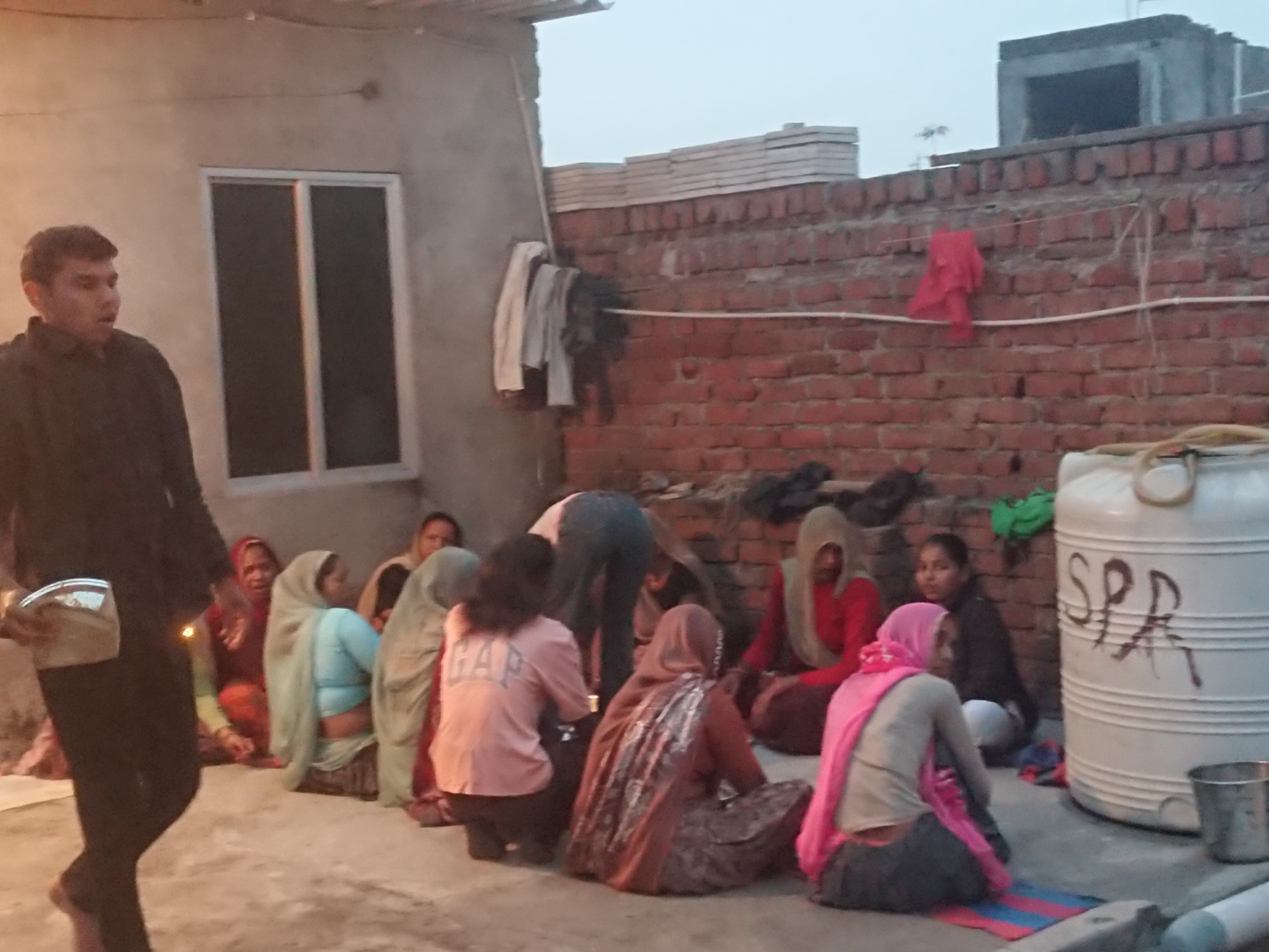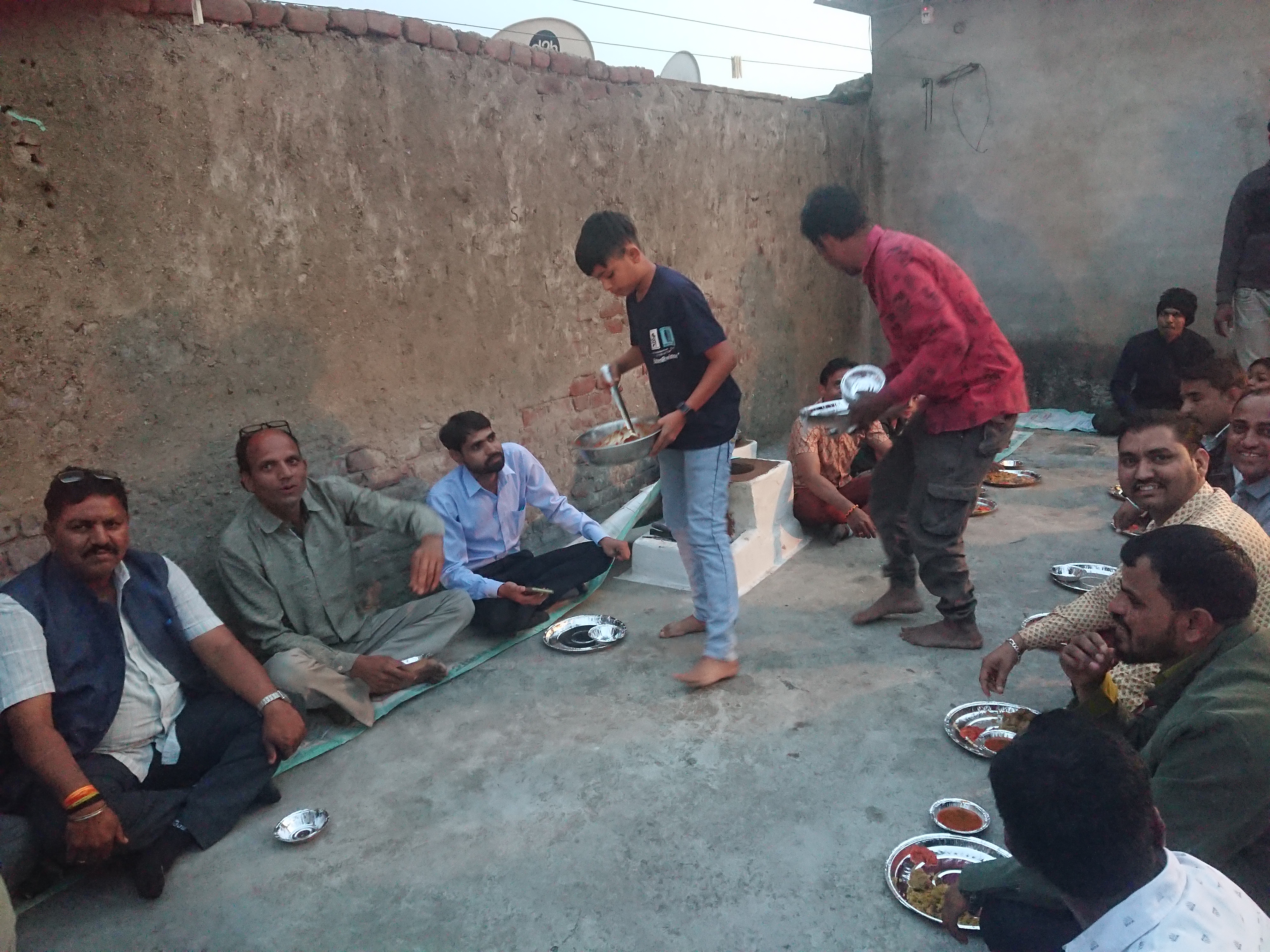 Vers 18 heures, nous sommes partis en voiture pour le village de la femme de Ramdev, le bras droit de Radhe à la ferme, situé dans la banlieue de Bhilwara, pour un événement lié à la grande nuit de Shiva (Mahashivaratri). À notre arrivée, Ramdev a emmené sa femme et ses deux enfants chez sa famille. Nous avons fait des allers-retours entre le temple et un repas collectif, les femmes d’un côté et les hommes de l’autre.