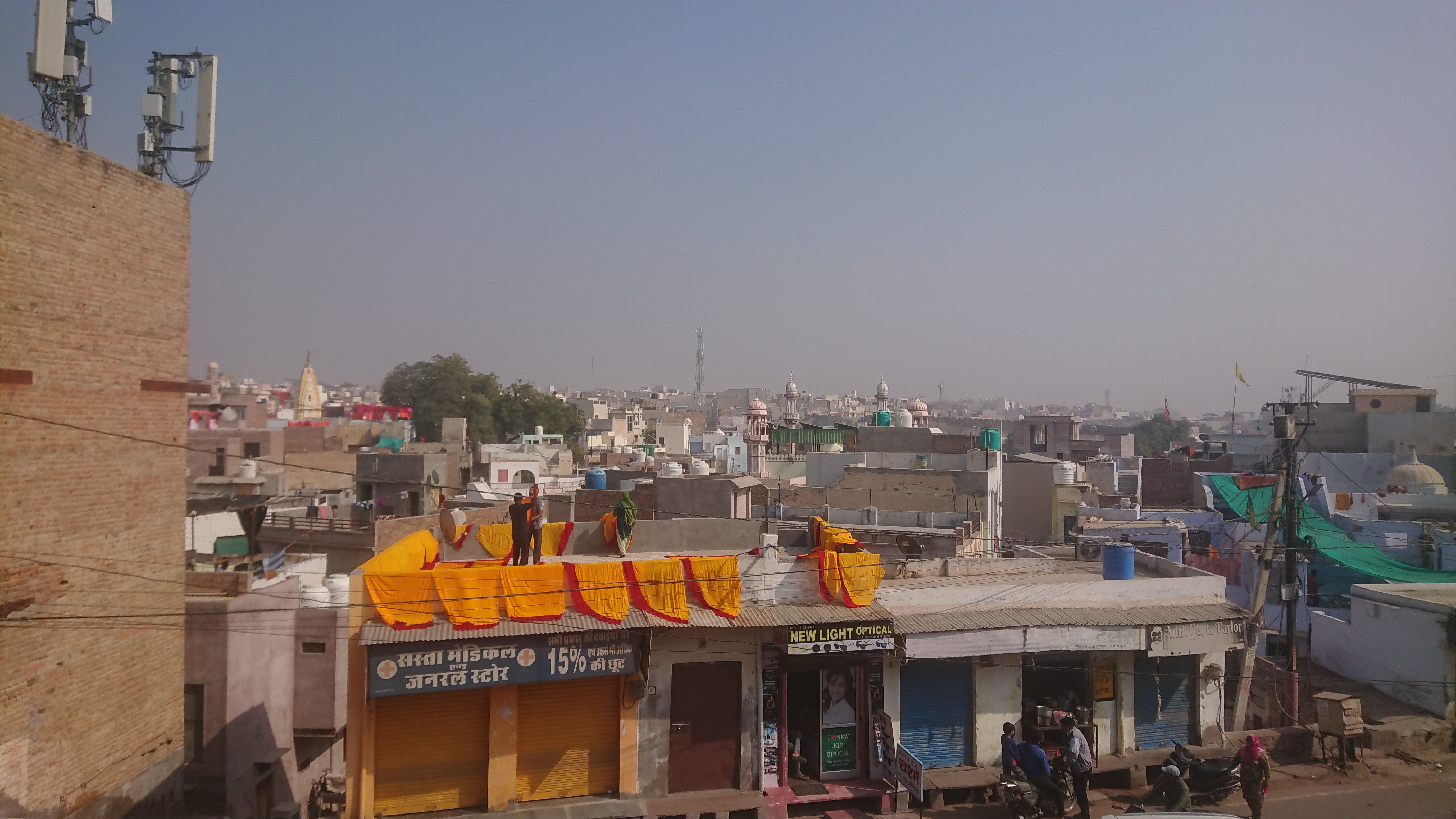 Ce matin, j'ai décidé de traverser Bikaner à pied pour aller jusqu'au temple jain Bhandasar. Si une chose a changé en 50 ans, c'est bien l'arrivée de Google maps, en ville mais aussi à la campagne. Le seul inconvénient est qu'il n'est pas adapté à la marche à pied. On ne va pas assez vite, aussi le GPS n'arrive à détecter votre sens de marche qu'au bout d'au moins 100 mètres. C'est pas grave, je repère la direction générale et y vais au pif. Je me perds souvent mais ça permet de découvrir des endroits inattendus comme ce matin le quartier des tisserands avec ces larges bandes de tissus multicolores (saris?) qui pendent le long des murs ou sont étendues sur les toits.