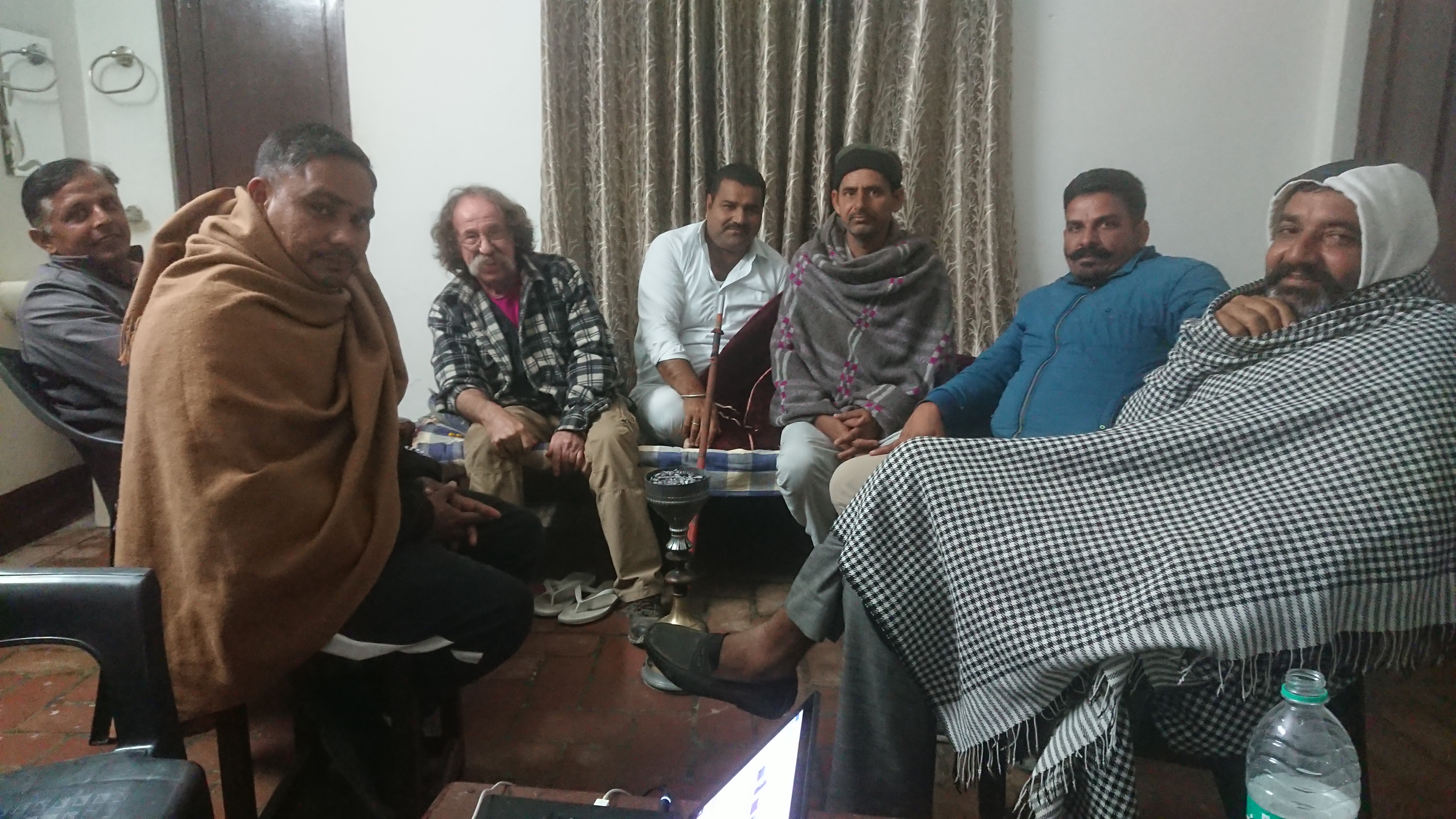 Comme c’est l’hiver et que les nuits sont fraîches, la veillée se déroule dans notre chambre. Ces messieurs arrivent les uns après les autres, disent un rapide bonjour collectif avant de s’installer sur un charpaï ou une chaise en plastique. La veillée commence vraiment lorsque Vinod arrive avec la houkha. Tout au long de la soirée, une personne se lève et quitte l’assemblée sans même dire au revoir, tandis qu’une autre arrive.