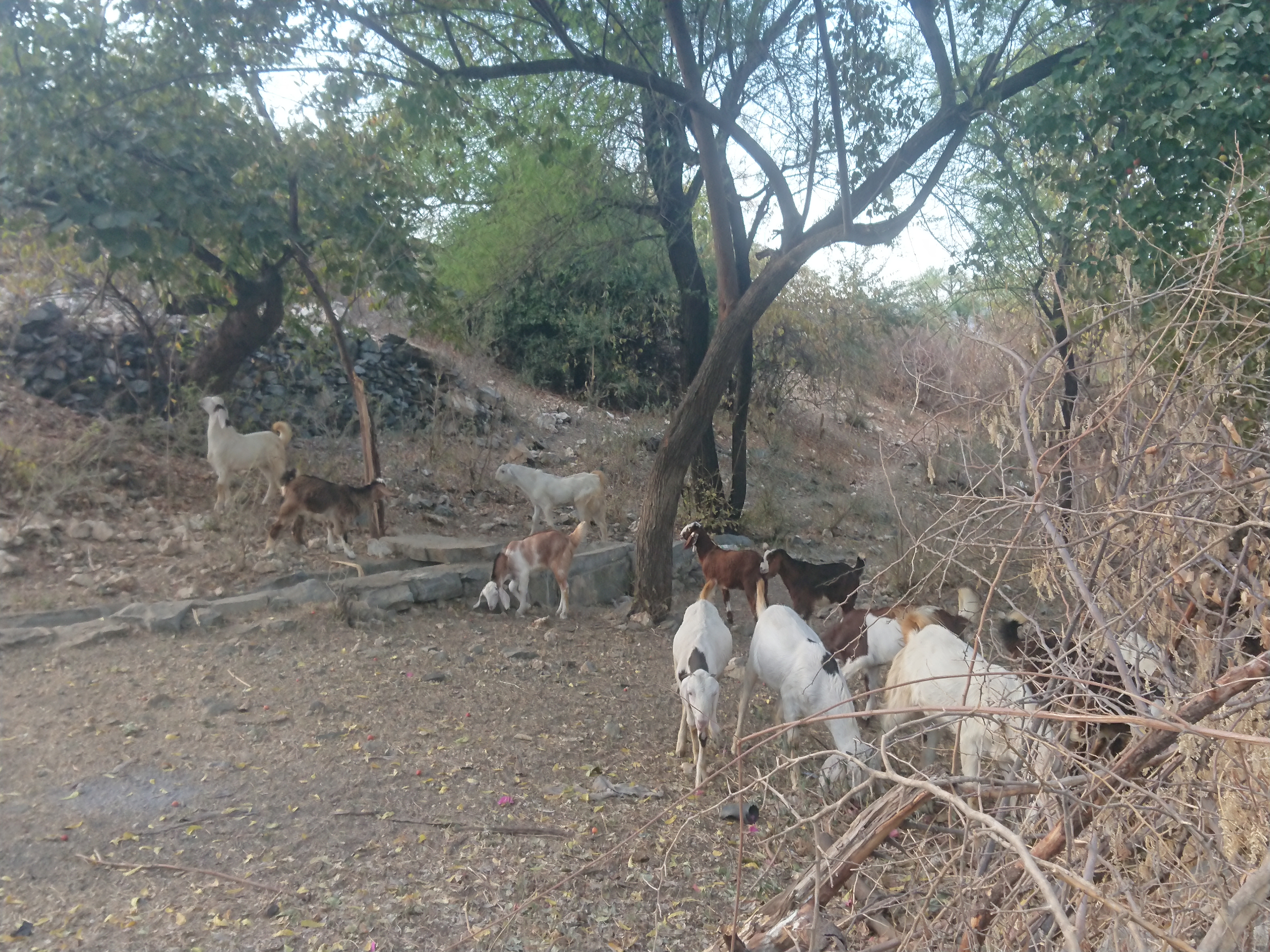 Les chèvres sont libérées le matin pour pâturer dans le terrain en friche, parfois en compagnie de vaches appartenant à des paysans sans terre que Naveen encourage à utiliser ses terrains afin de récupérer la bouse comme engrais. Elles sont rentrées le soir et le chien est mis en cage, car une panthère rôde dans les environs. Apparemment, les nilgaïs ne la craignent pas, car ils occupent les lieux dès qu’ils sont libres.