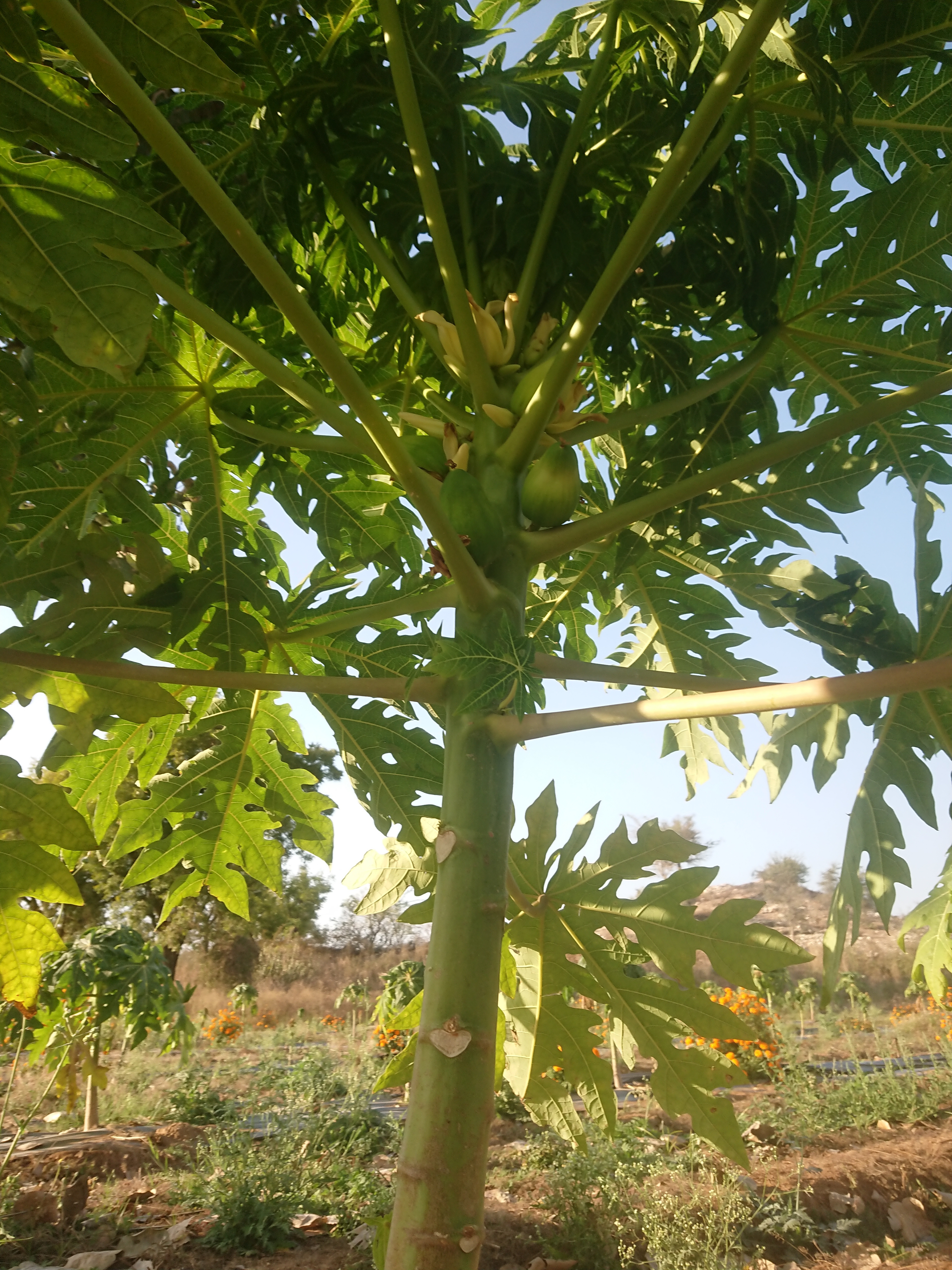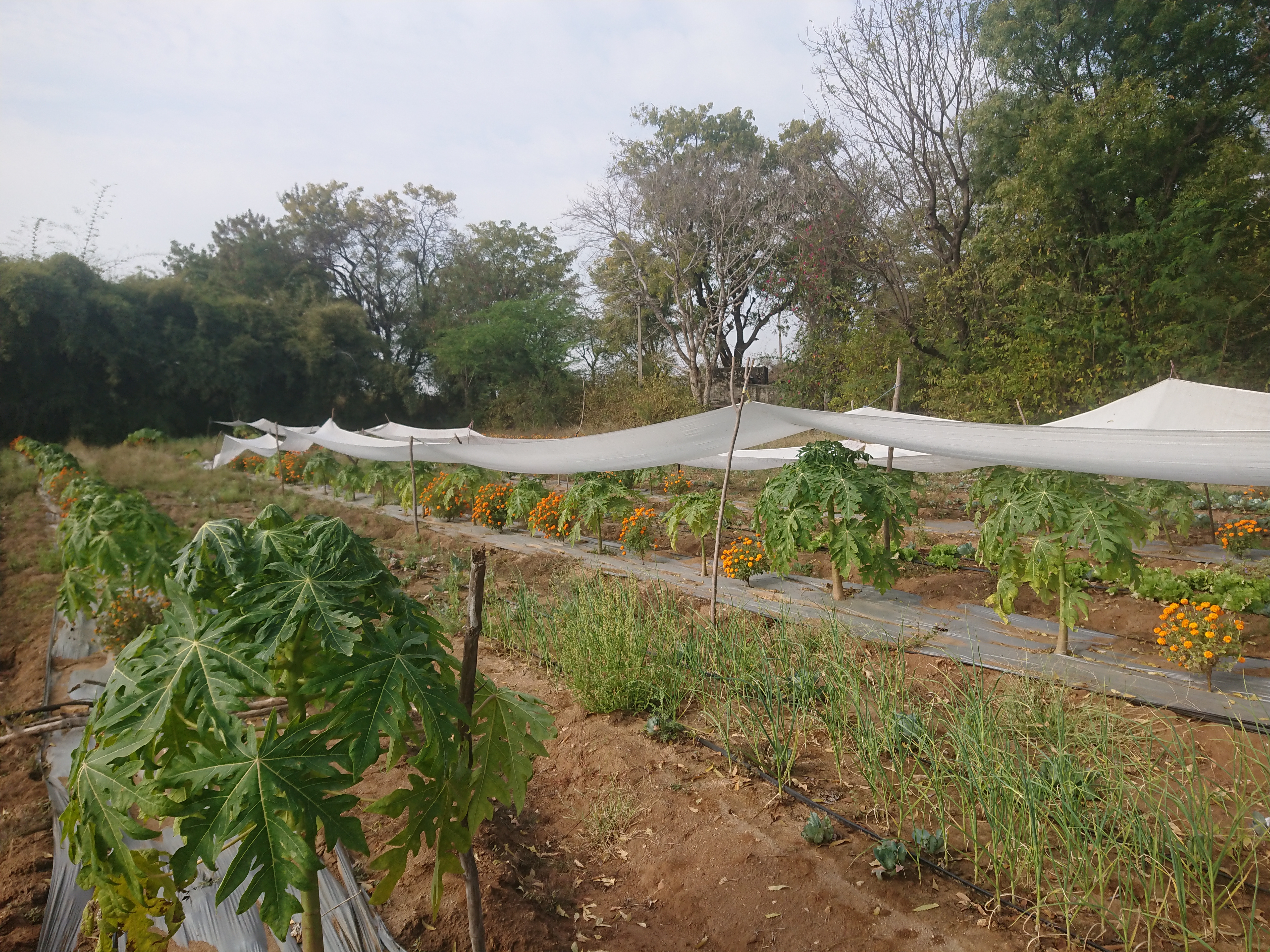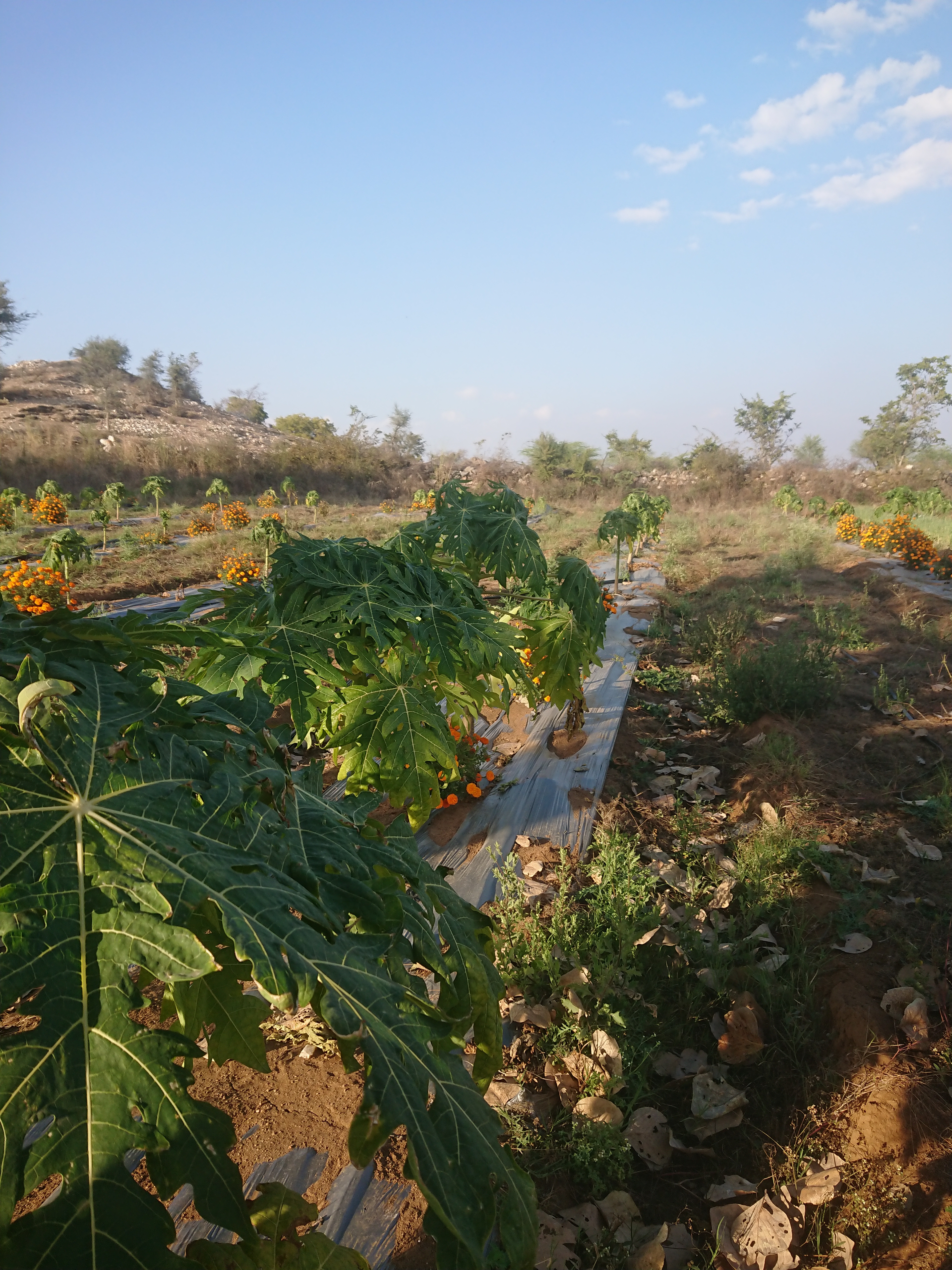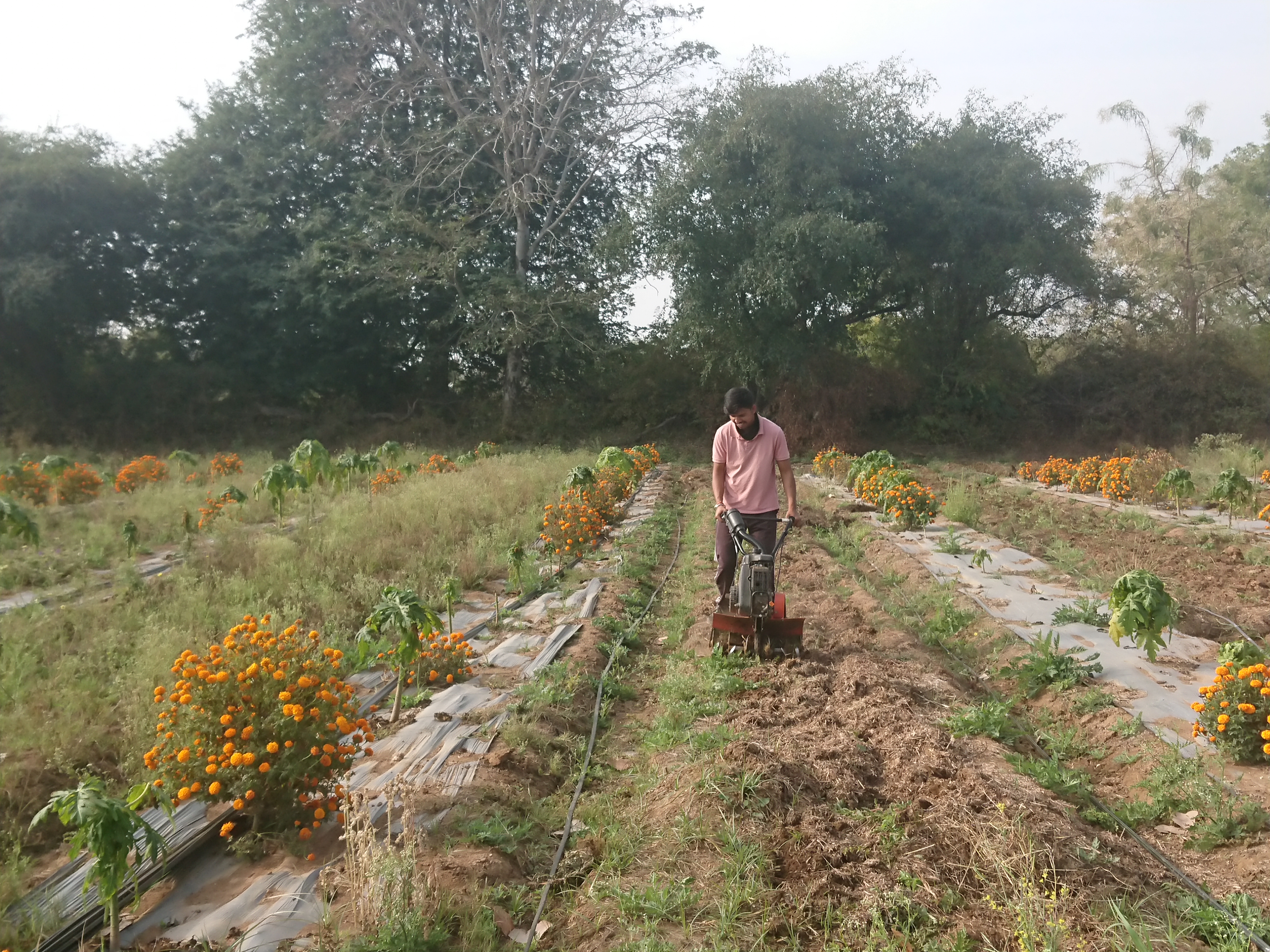 Sur ces planches, Naveen a planté 2 000 papayers cet automne, mais seulement 1 500 ont survécu. Ils peuvent produire jusqu’à 100 kilos de papayes par an au bout de 10 mois, mais ils s’épuisent vite, ce qui explique que Naveen prévoit de les remplacer tous les trois ans. En alternance, il a planté autant de pieds de soucis. Les plus grosses fleurs sont récoltées quotidiennement de novembre à mars pour la confection de guirlandes destinées aux dieux, aux dignitaires ou aux mariés. Naveen les vendait initialement au prix du marché, soit 20 roupies le kilo, mais son client s’est rendu compte que le bio assurait une meilleure conservation des fleurs et les lui achète aujourd’hui à 50 roupies le kilo — le seul exemple depuis mon arrivée où le bio permet d’obtenir un meilleur prix.