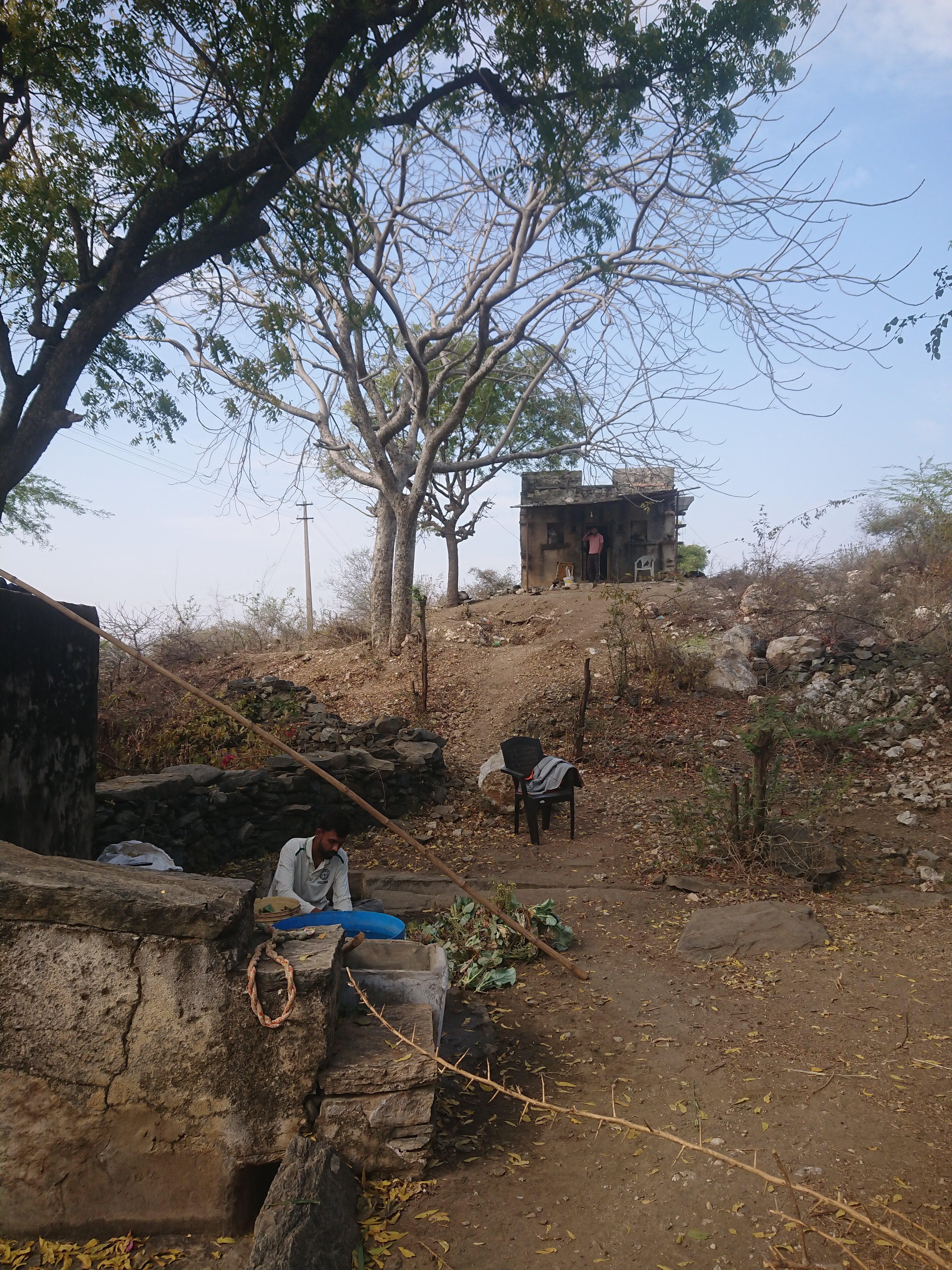 Dans la première réside habituellement un couple d’employés de la ferme. Ils sont retournés dans leur village pour Holi[3], la fête des couleurs, leur seul congé annuel, qui dure un mois bien que la date officielle soit le 8 mars. Les religieux prolongent souvent les célébrations jusqu’à un mois.