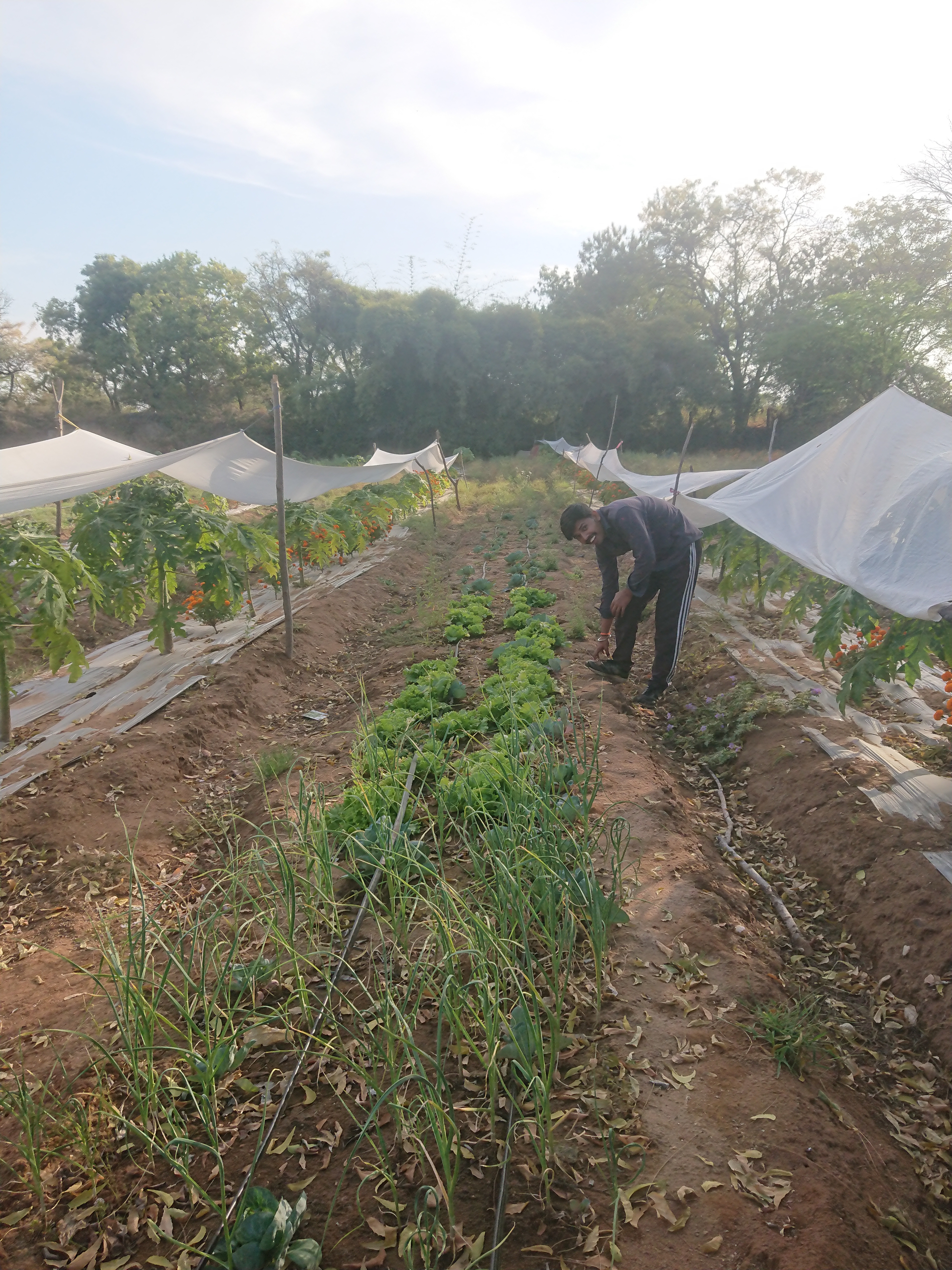 De l’autre côté de la butte, en contrebas, s’étend la zone de maraîchage, le domaine de Naveen, qu’il a commencé à exploiter cet automne. On y retrouve les mêmes techniques que chez nous : cultures sur planches de 80 cm de large avec une, deux ou trois rangées de goutte-à-goutte selon les plantations, couverture en plastique noir pour le moment, mais Naveen souhaite passer le plus rapidement possible à un paillis végétal. L’irrigation se fait à partir d’un puits, d’où part un tuyau qui traverse le terrain au centre. Un système de vannes permet d’arroser par tiers. Il a installé un injecteur Venturi[5] au départ du système pour pouvoir ajouter des solutions nutritives ou de traitement à l’eau d’arrosage. Demain, il utilisera une solution à base d’eau et de cendres de bois, qui apporte du potassium.