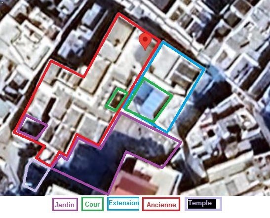 Le portail d’entrée s’ouvre sur un vestibule d’accueil avec deux plateformes cimentées faisant office de salle de réception, suivi, sur la droite, d’un ensemble petit salon/chambre, et sur la gauche, d’une ouverture sur l’espace privé correspondant à la maison initiale et à son extension.