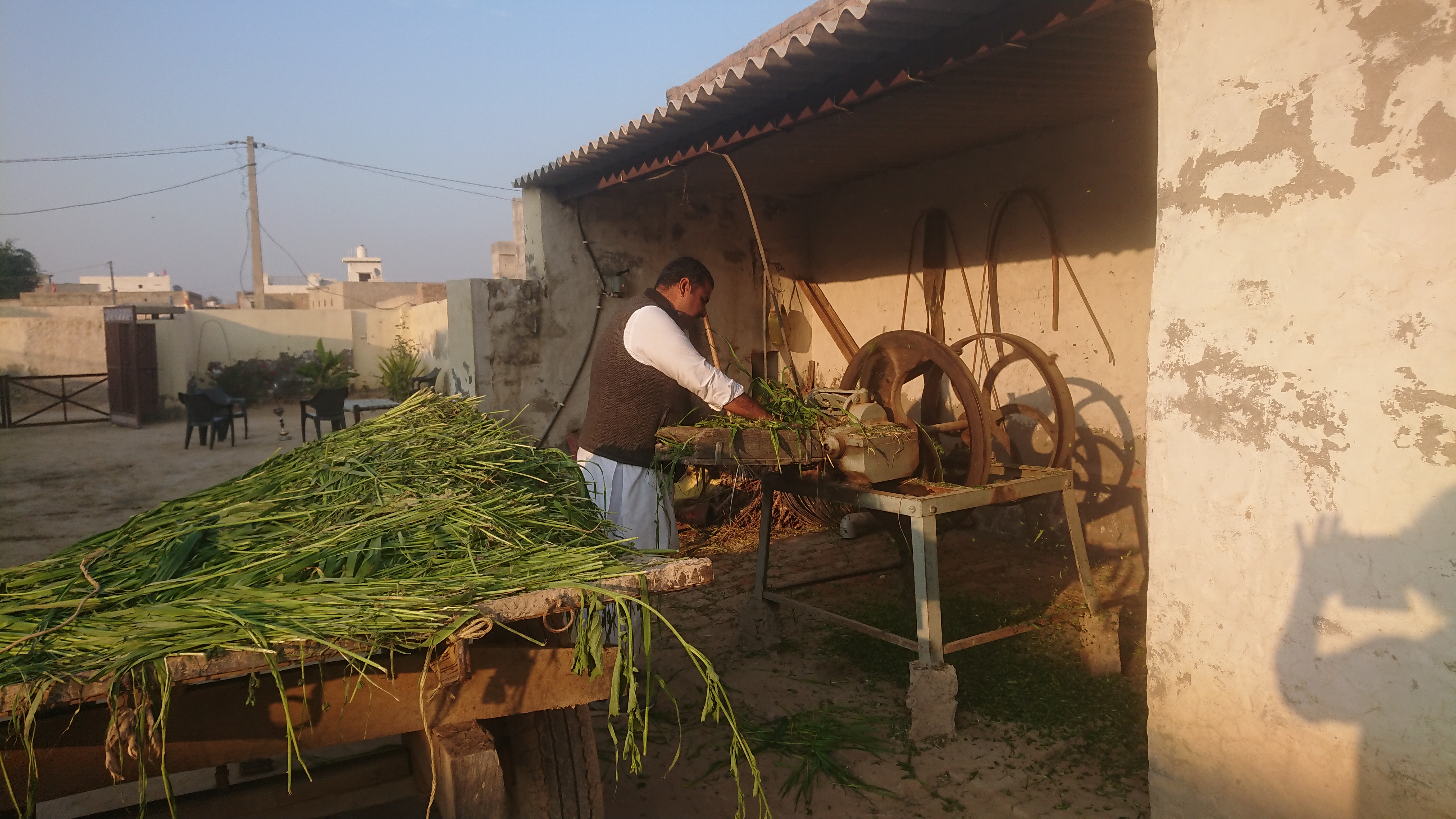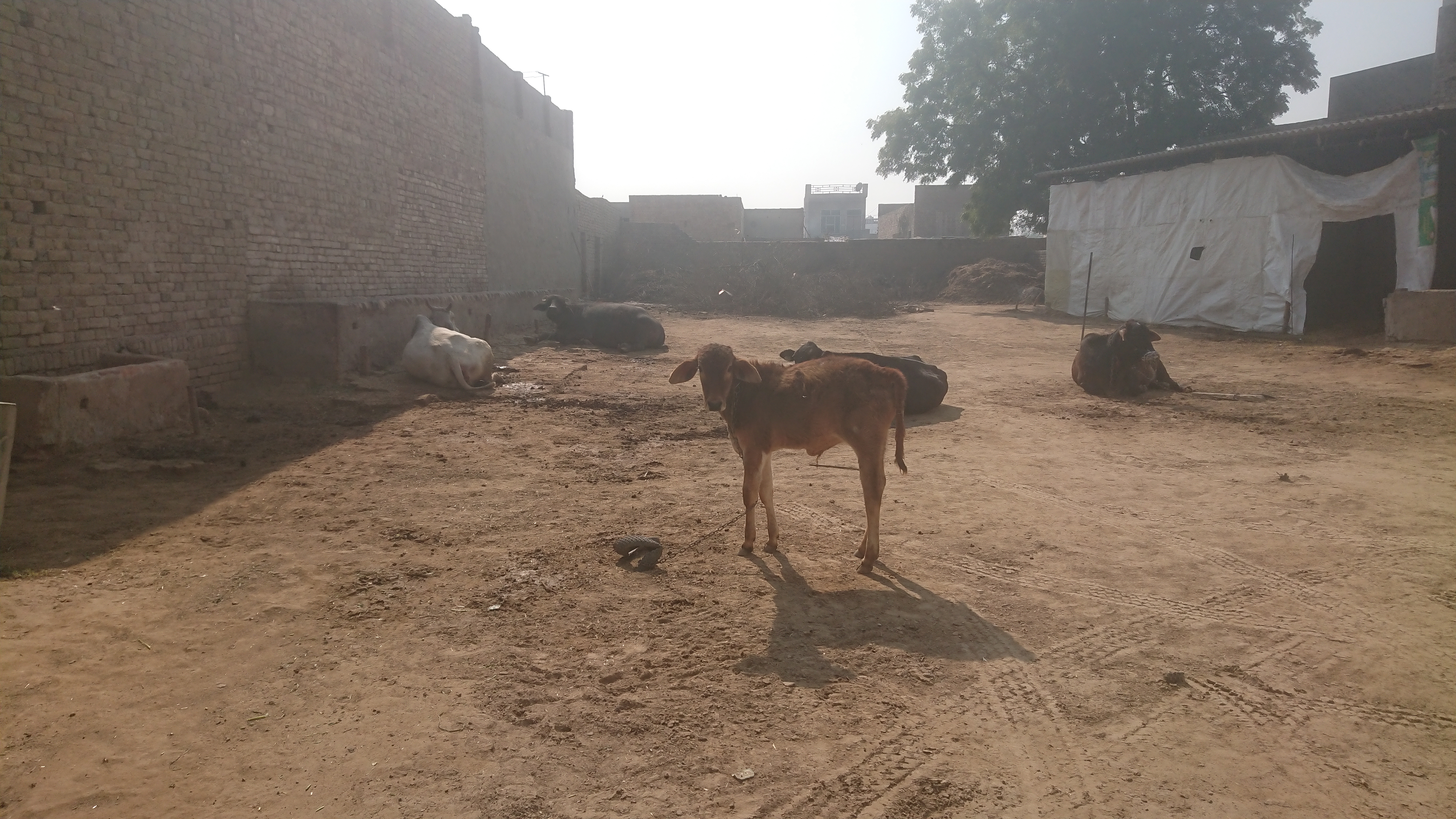 À l’arrière de la maison, il y a l'étable, avec deux vaches et un veau de race indienne (à bosse), ainsi que deux buffles. Les bovins sont sortis tous les matins et attachés à des piquets dans la cour.